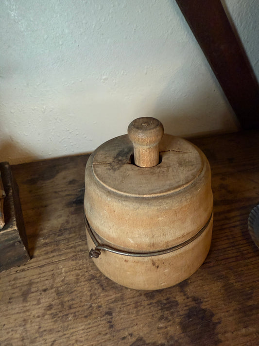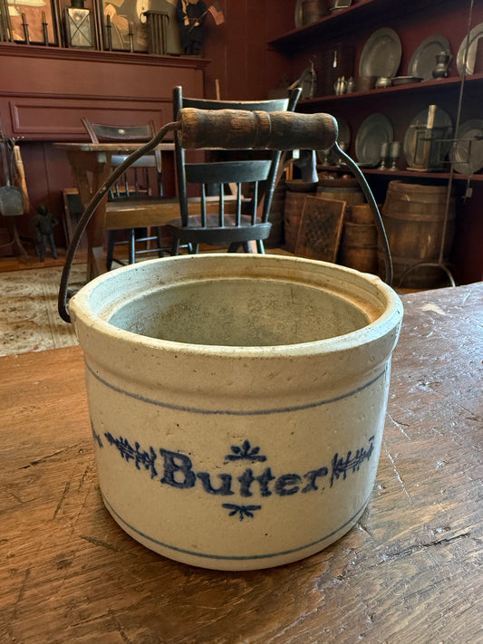 Butter Crock with Wooden Bail Handle/Cobalt Blue Decoration