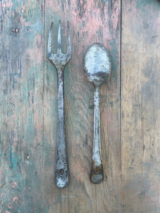 Early 1900s Antique Primitive Large Metal Serving Fork & Spoon