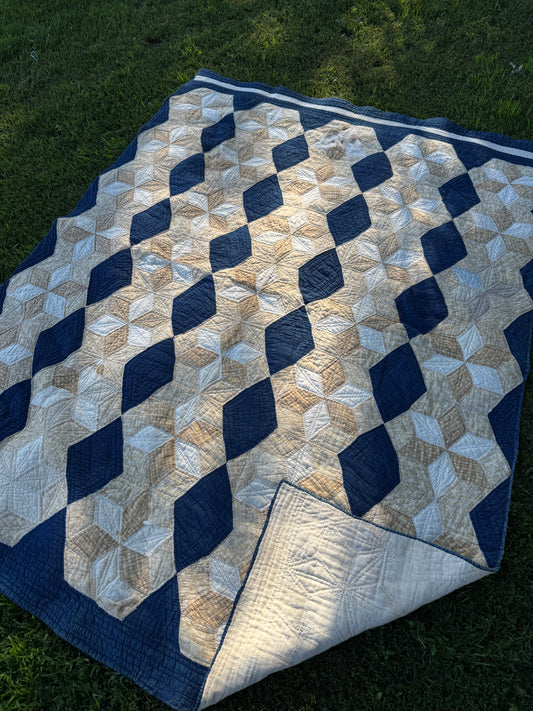 Late 1800s Hand-Stitched Antique Quilt in Navy/Creams - Tumbling Blocks Pattern