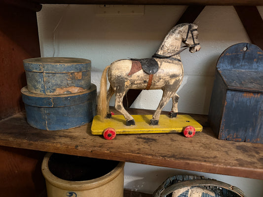 Wooden Painted Horse Pull Toy on Yellow Cart