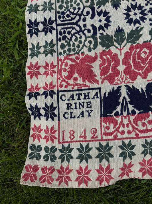 Rare 3-Color (Green/Red/Blue) Floral/Star Motif Signed Coverlet - Catherine Clay 1842