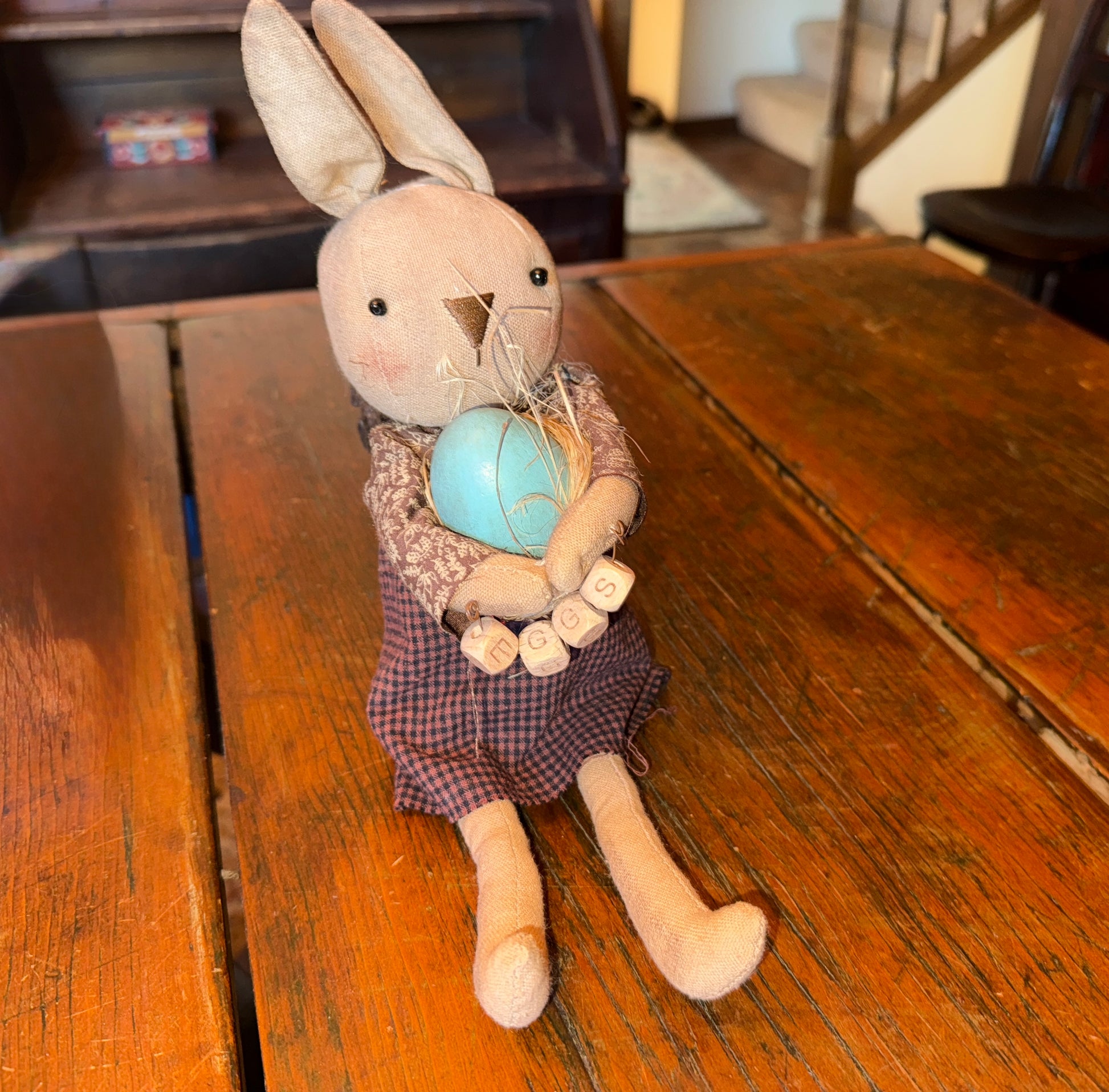 Bessie Bunny is 12” tall. She holds a Robin’s egg in her arms. She’s ready for Spring!