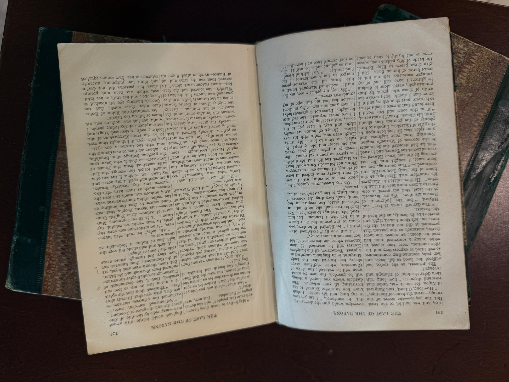 Three-volume set by Edward Bulwer-Lytton, bound in green leather with marbled boards and marbled page edges. Raised bands, gilt tooling, and original armorial bookplate of Symons Lister.