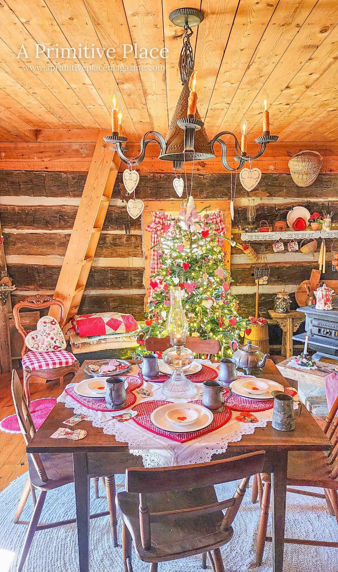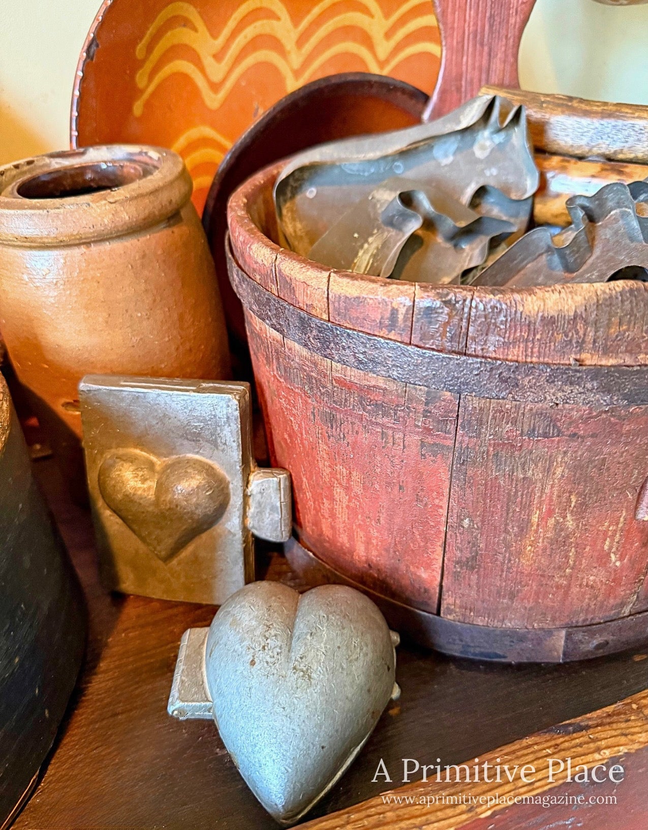 For Jean Salisbury-Elden and her fiancé, Ray Baker, primitive style is a way of life shaped by timeworn wood, humble textures, and handmade items. Their upstate New York home exudes rustic primitive warmth, defined by early treenware, warm red accents, and stitched hearts that quietly mark the Valentine season. Jean’s approach is subtle: a few clay hearts tucked among wooden bowls, a feed sack heart on a peg rack, or a tin heart resting inside a wreath. With Ray’s eye for antiques and Jean’s love for soft patina, their home celebrates the craftsmanship of the past and the enduring love found in every handmade piece.