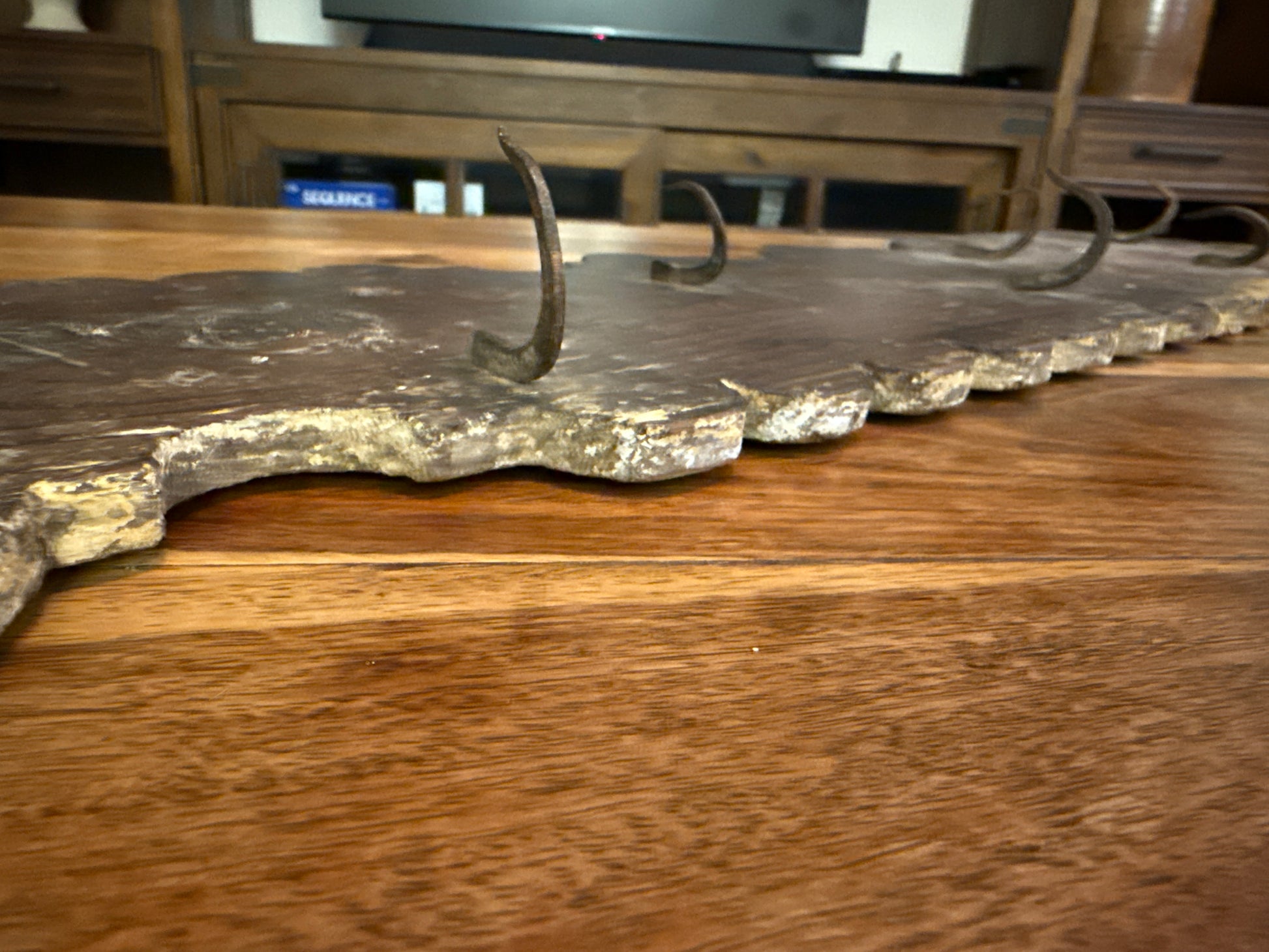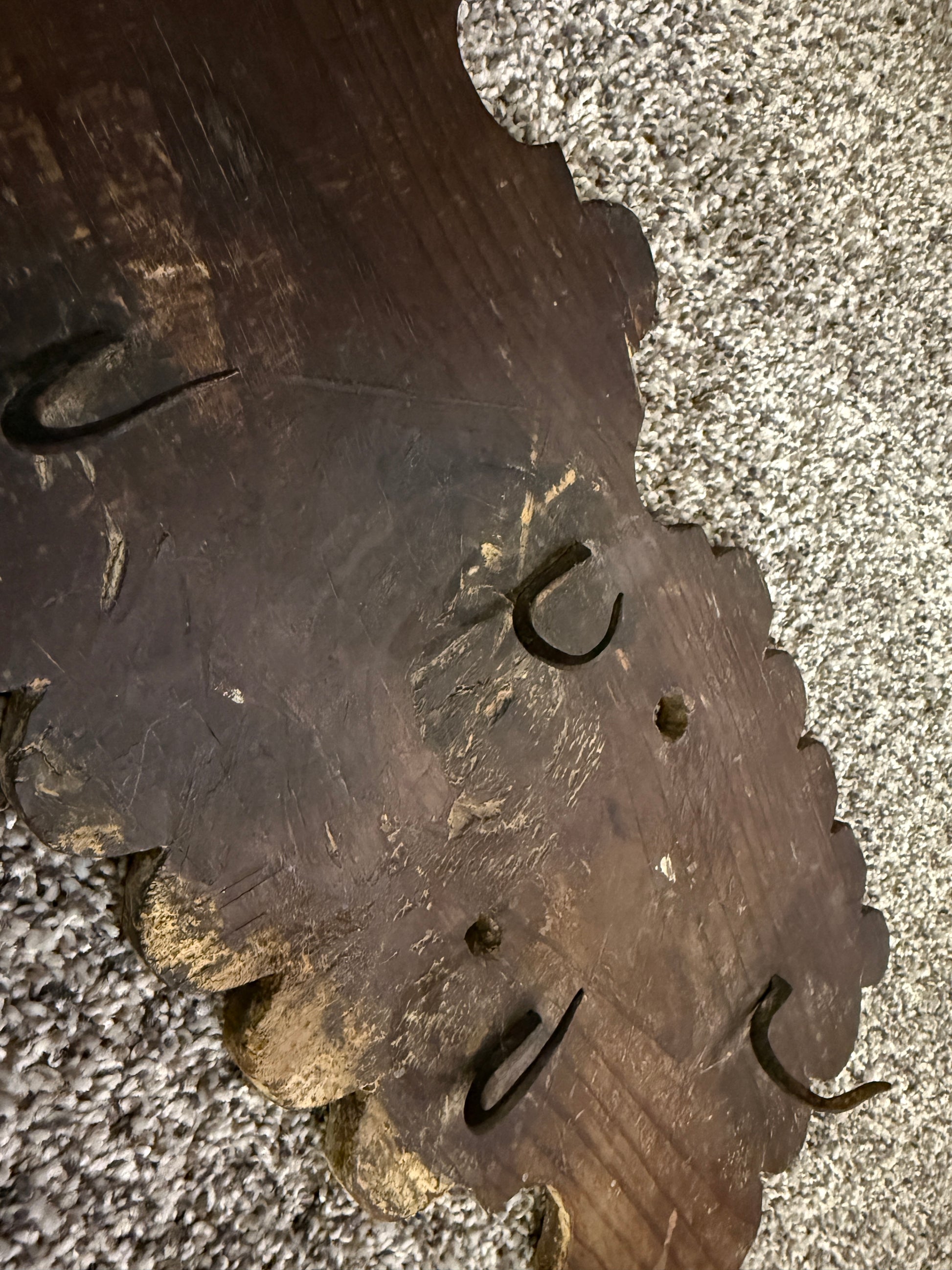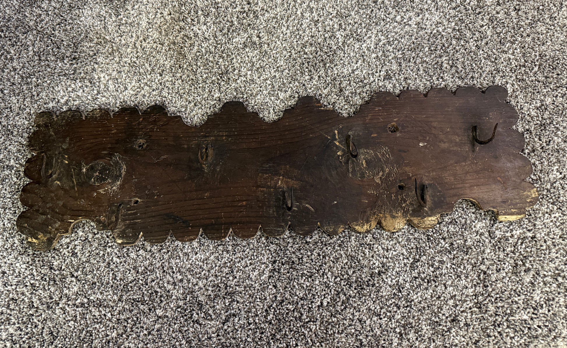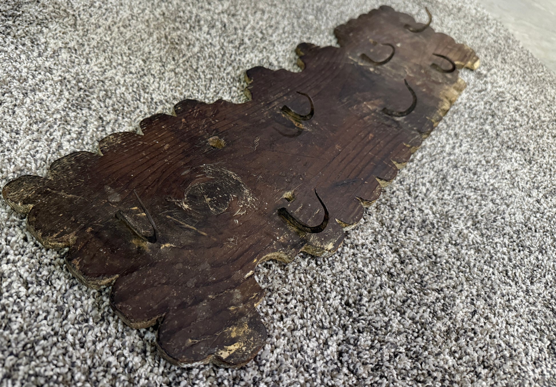Hand-carved single board with scalloped edges with seven original hand-forged hooks. Traces of white paint