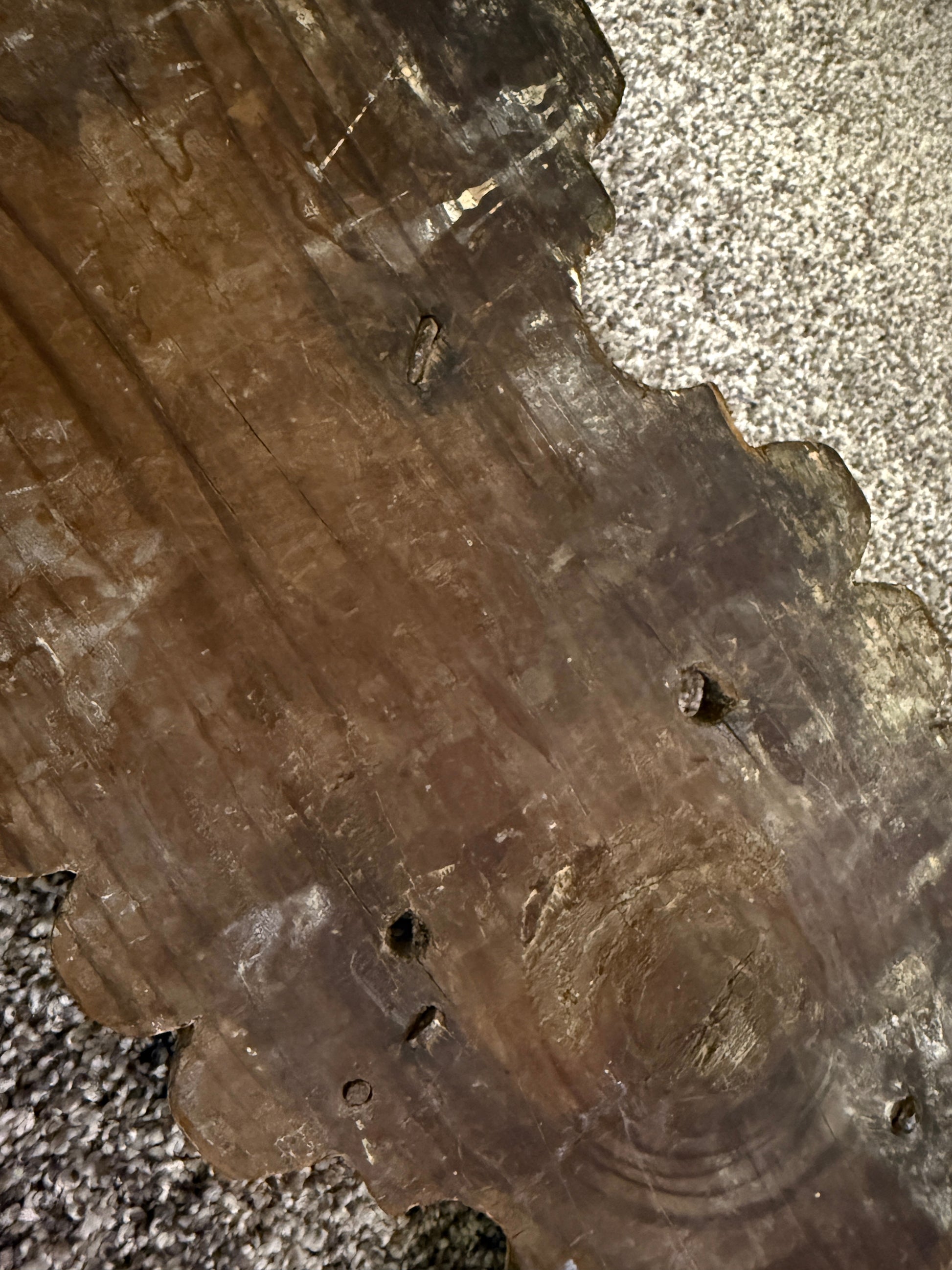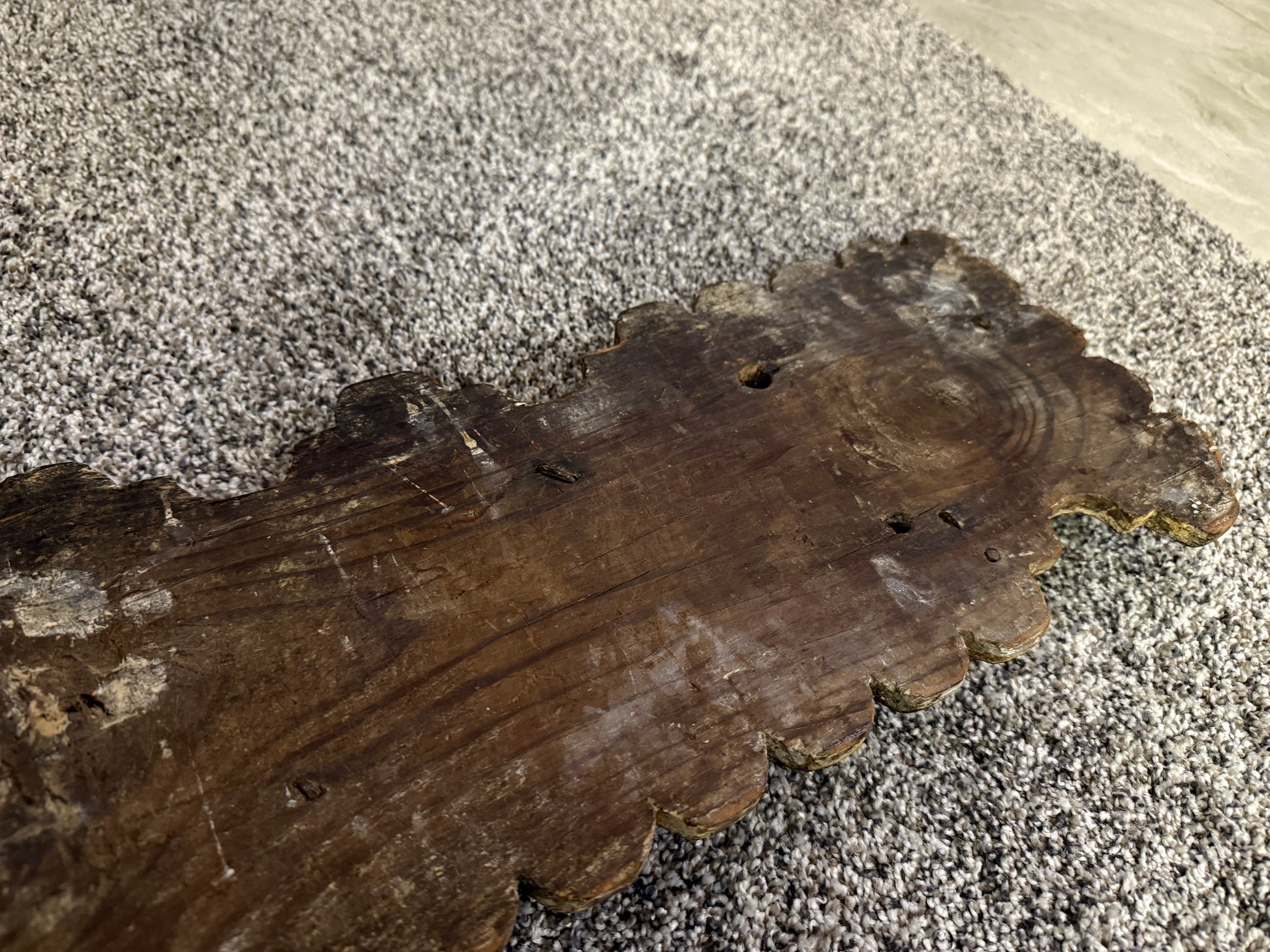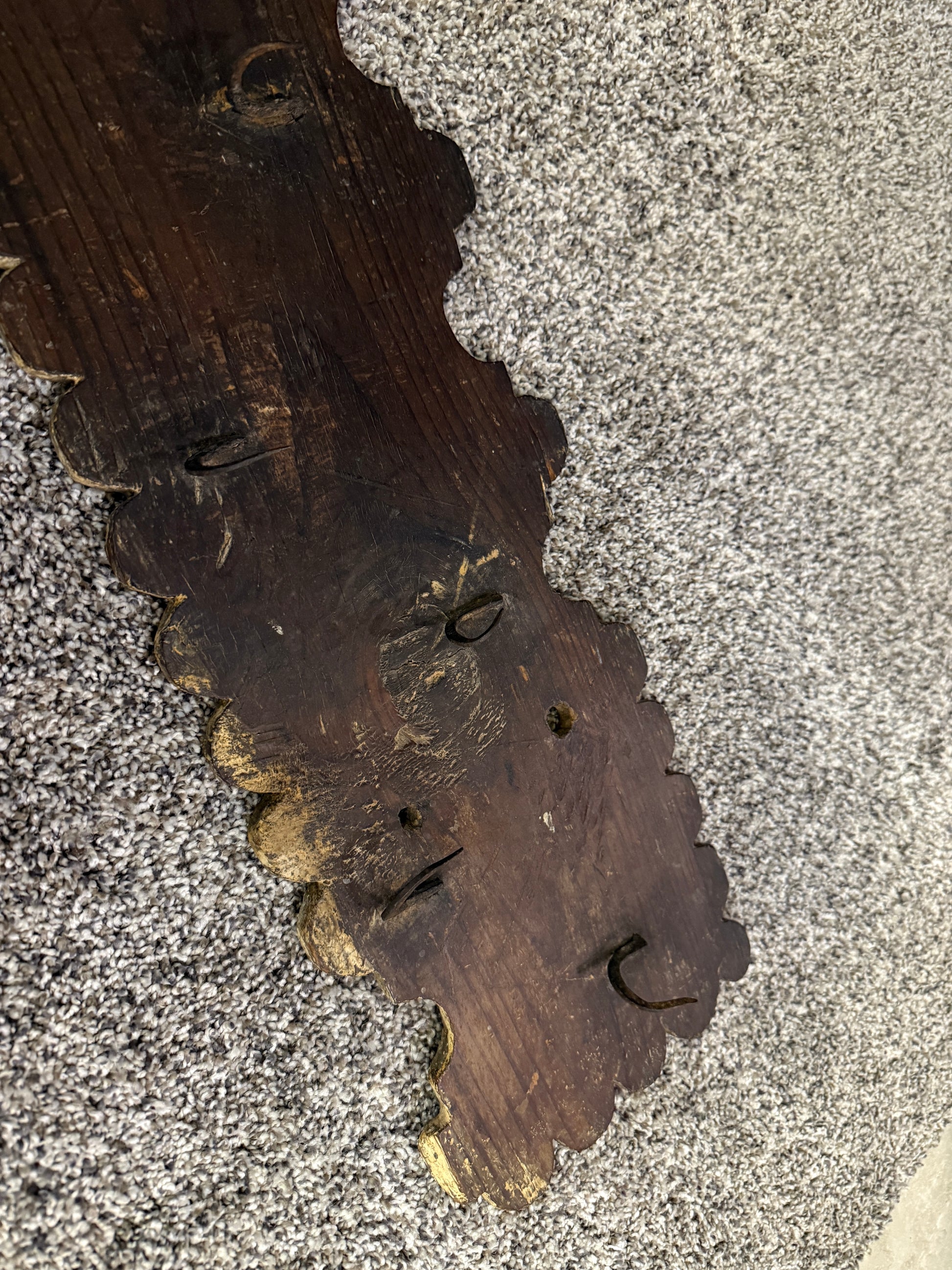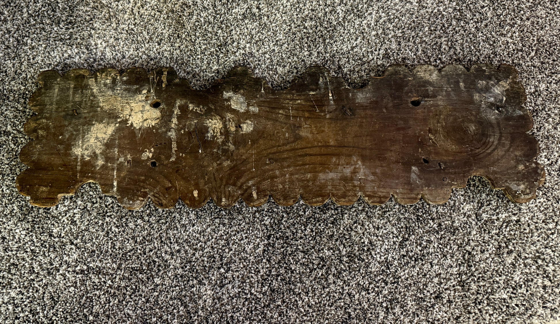 Hand-carved single board with scalloped edges with seven original hand-forged hooks. Traces of white paint