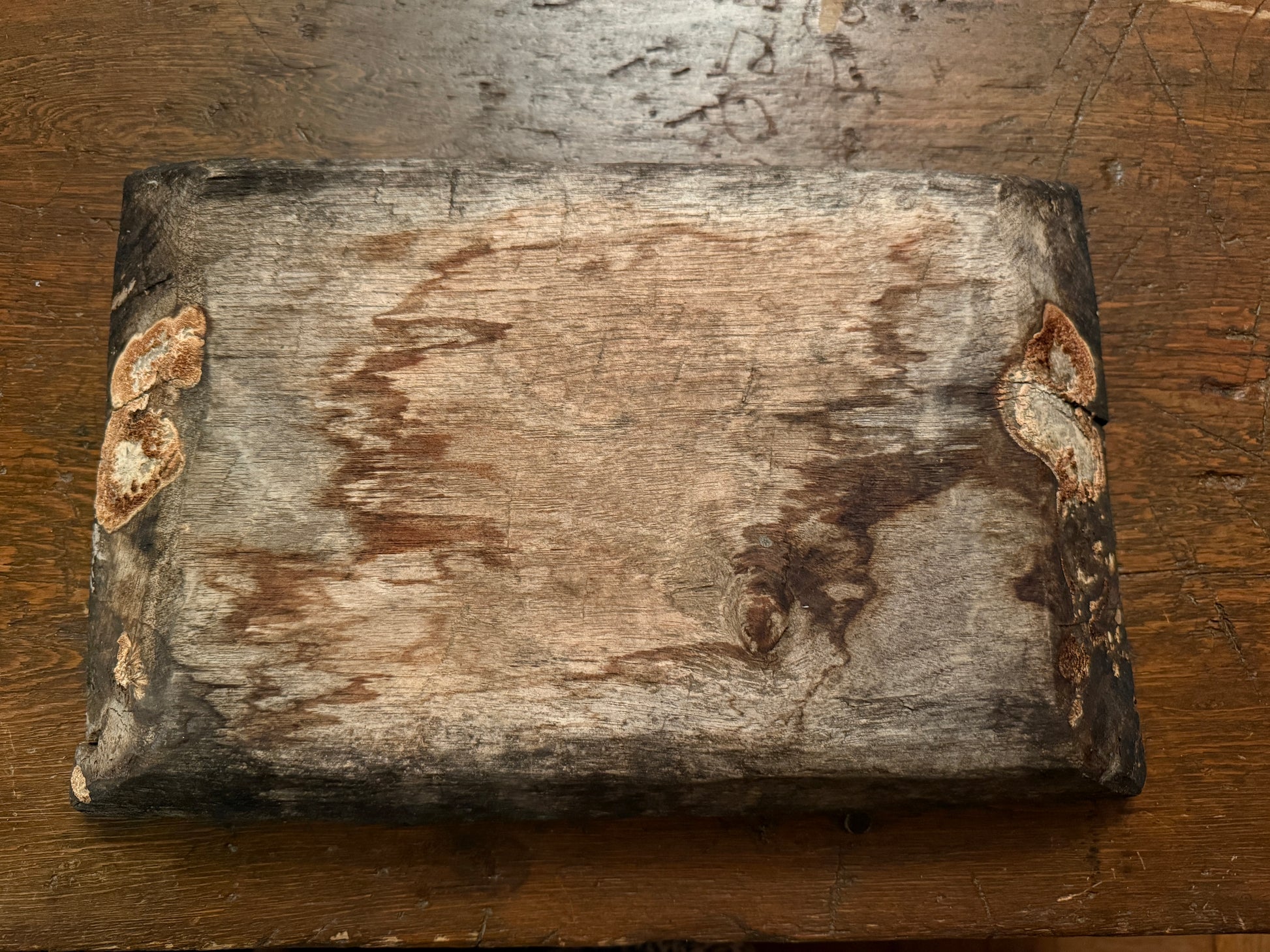 Early hand-hewn trencher, circa 1780-1820. Carved from a single block of hardwood with an untouched dry surface and traces of blackened patina from hearth use. Measures 13 3/4” x 8-3/4” x 2”.