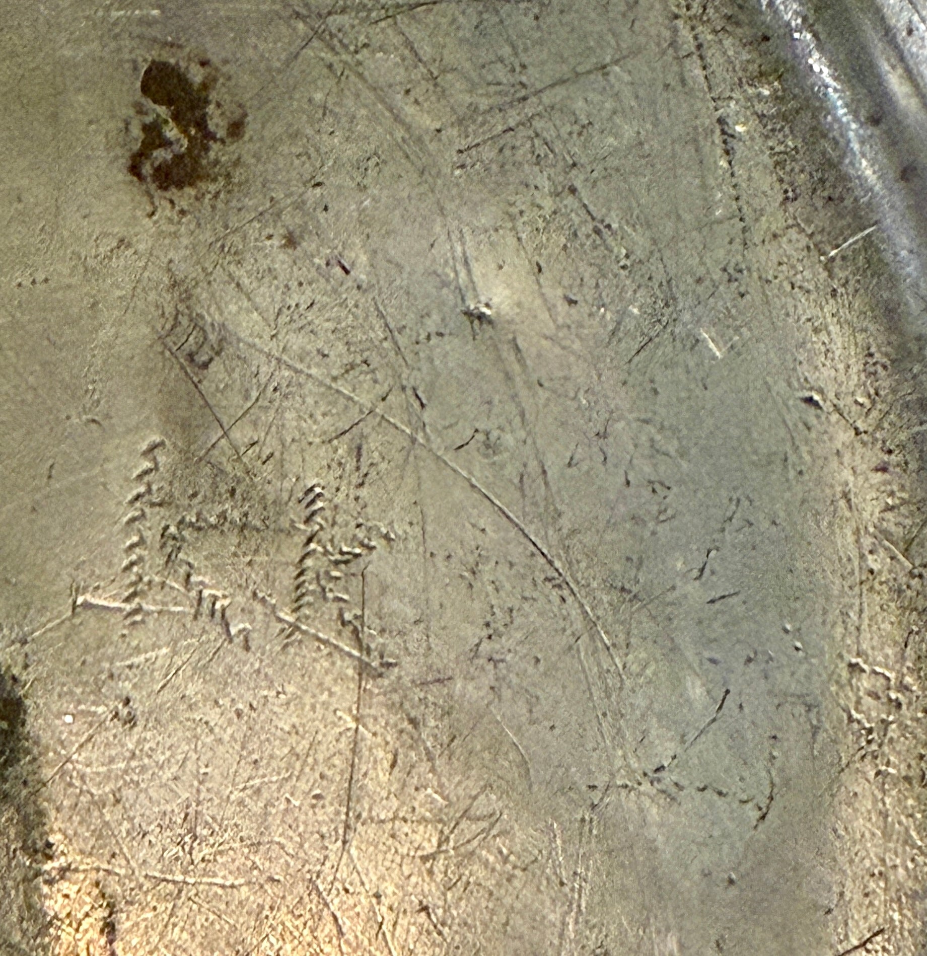 Early rolled-rim pewter plate with classic late 18th-century form. Features oxidized utensil wear, faint early ownership marks, and strong lathe-turned rings on the underside. Made from the tin/lead alloy typical of period household pewter.