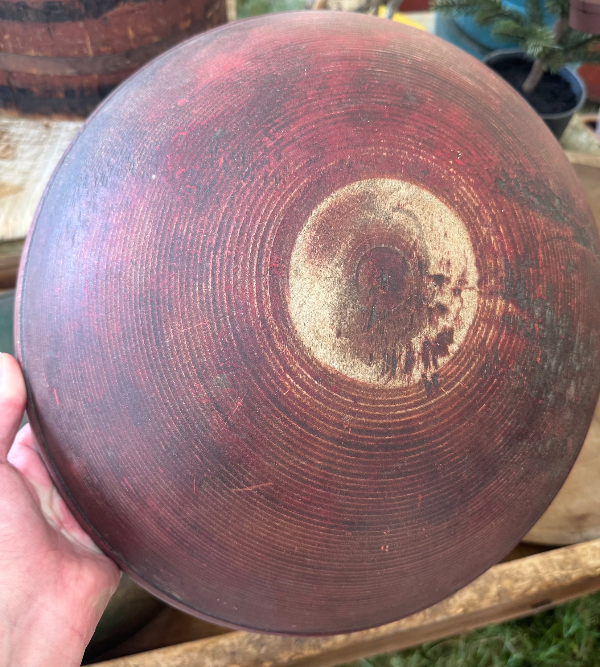 Early Wooden Bowl in Original Red Paint - 14”