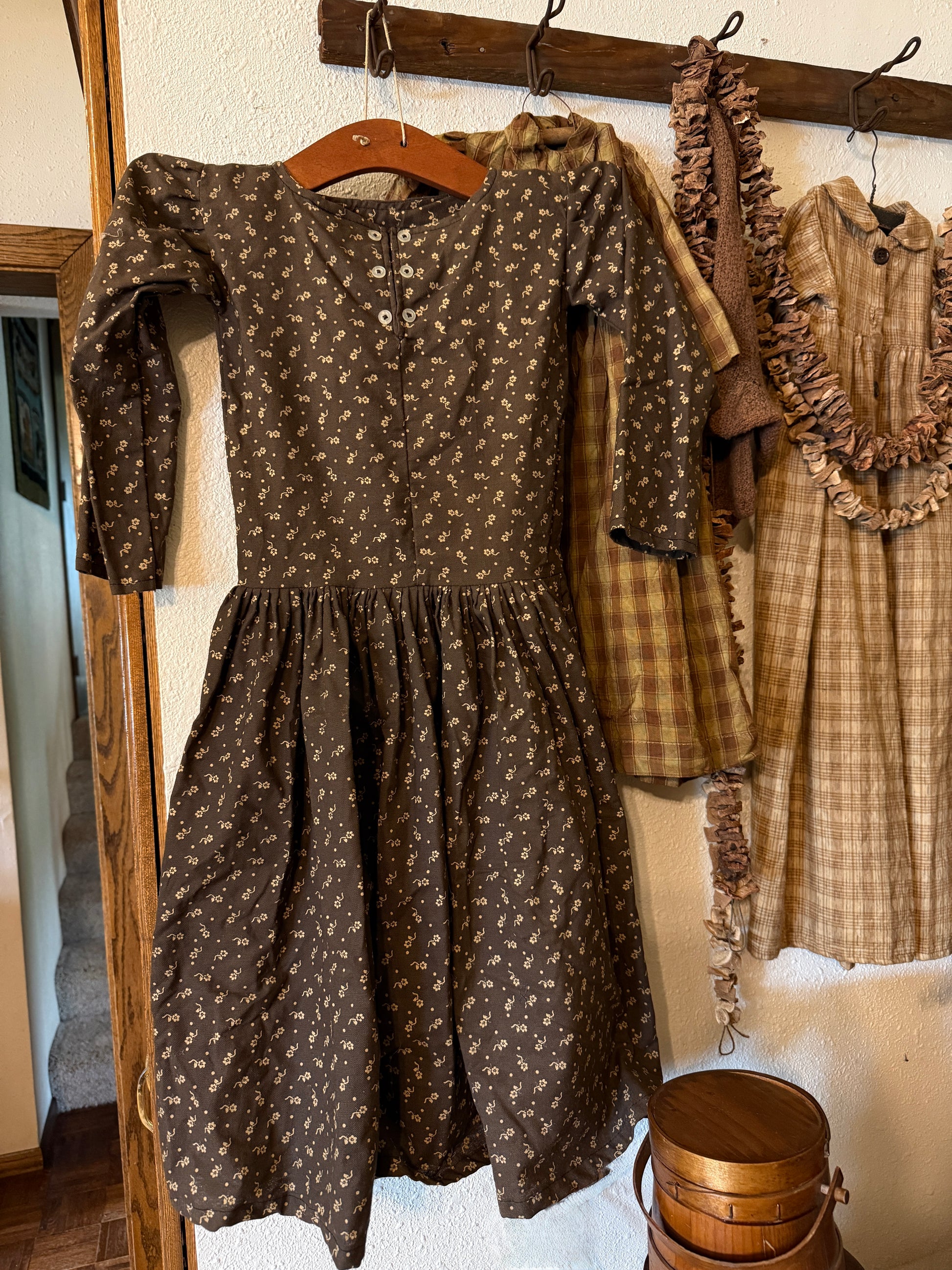 A brown reproduction prairie dress. It is 30" long. Price includes shipping.