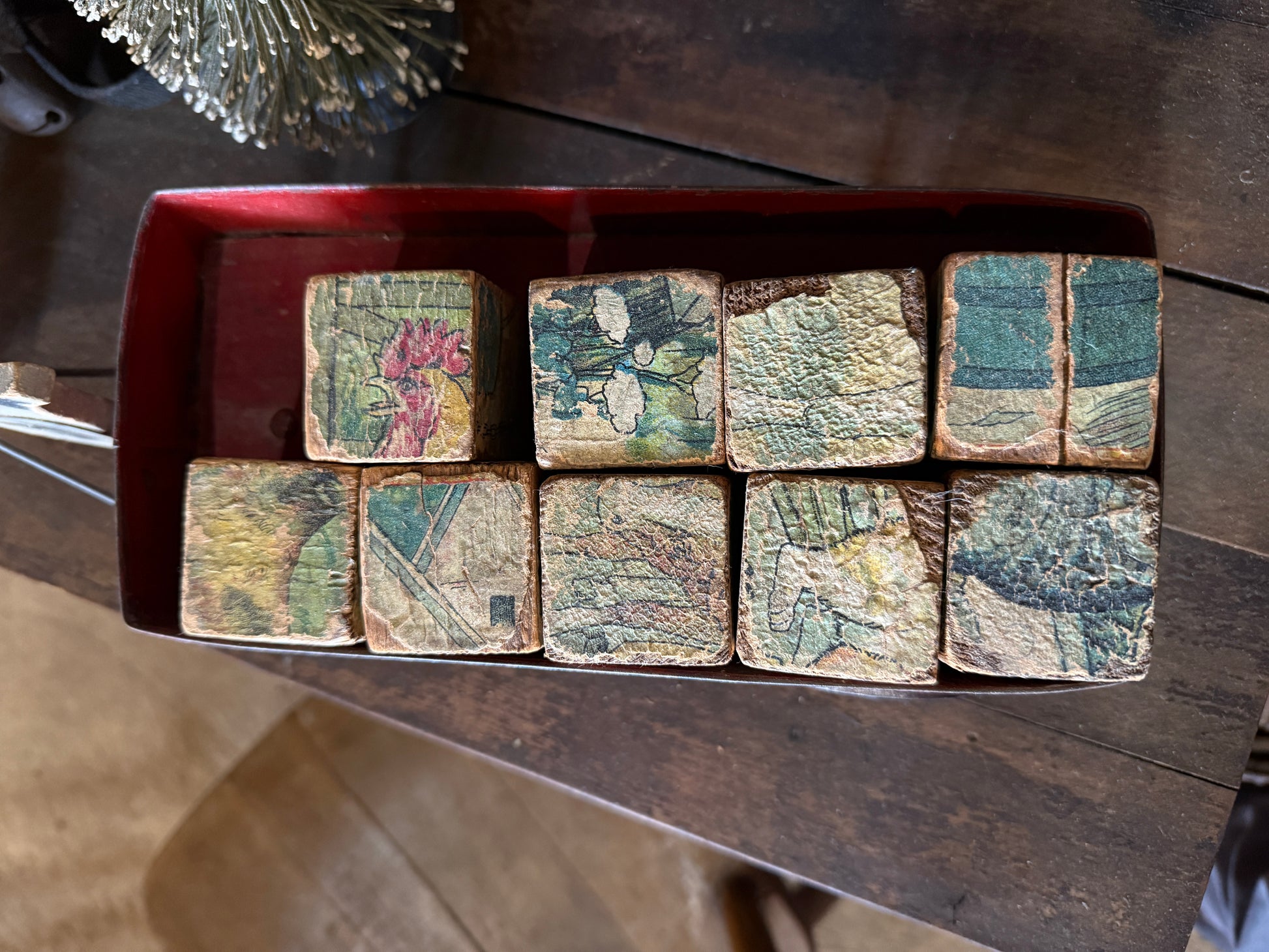 Late 1800s Antique Dog pull Toy with Wagon & 9 Blocks