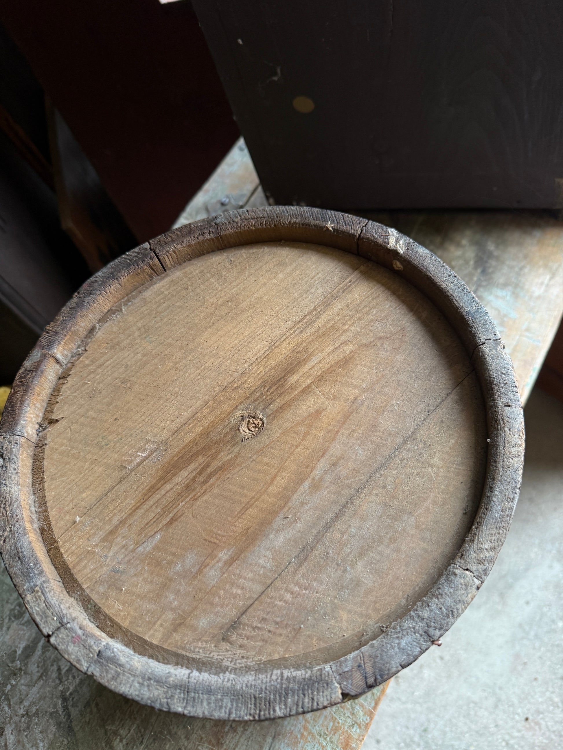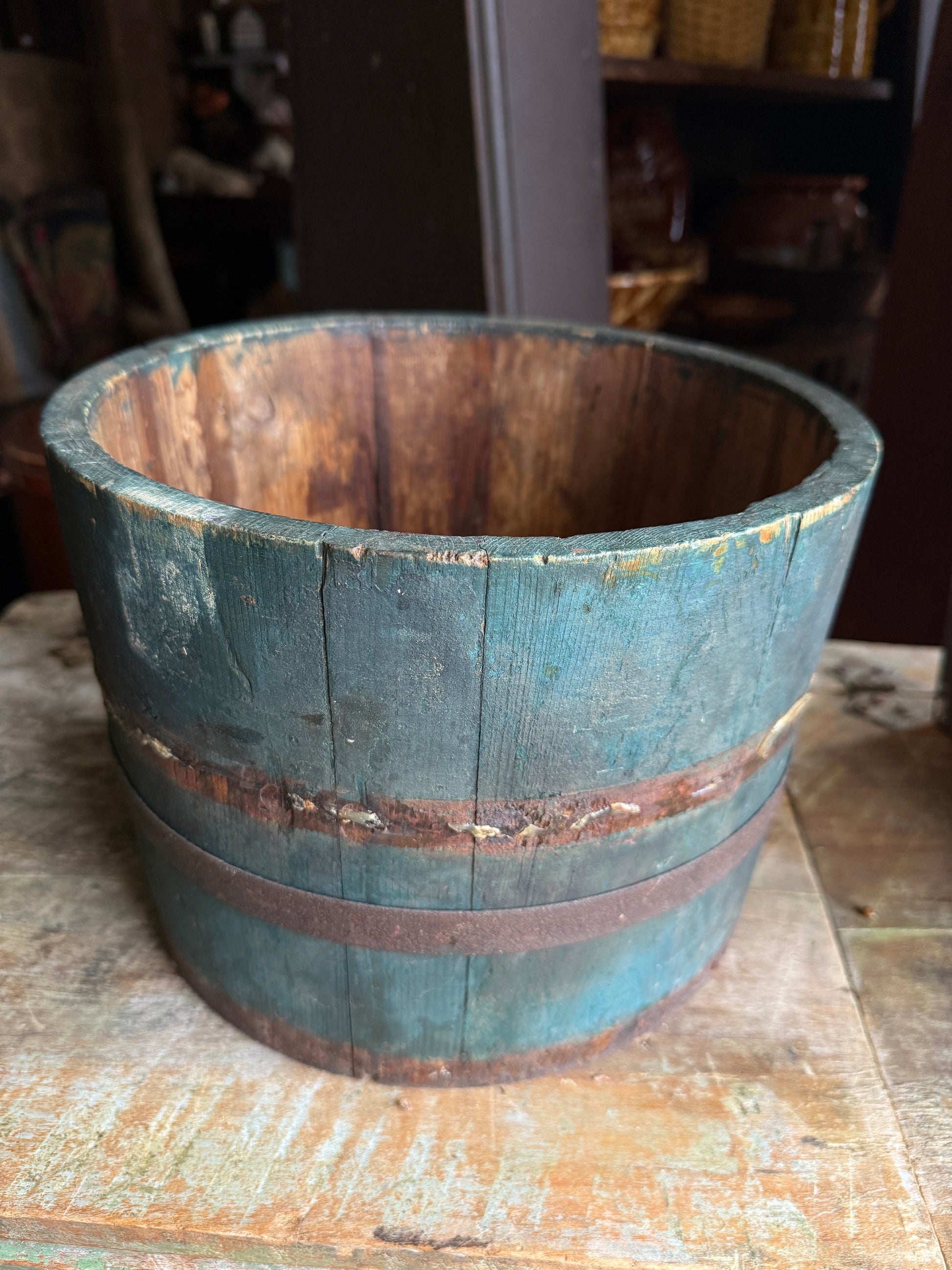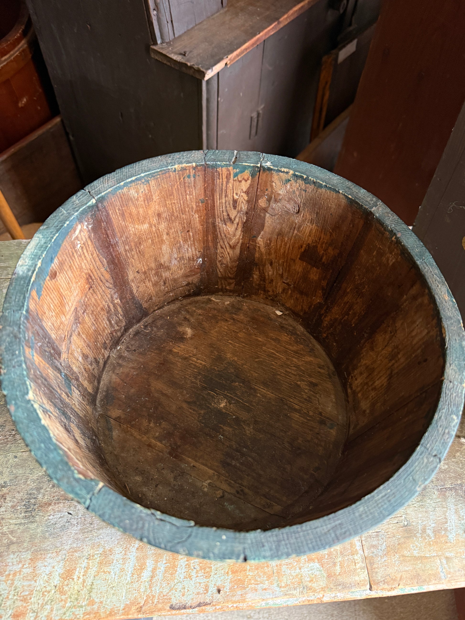 Mid-1800s Wooden Staved Bucket in Original Blue/Green Paint