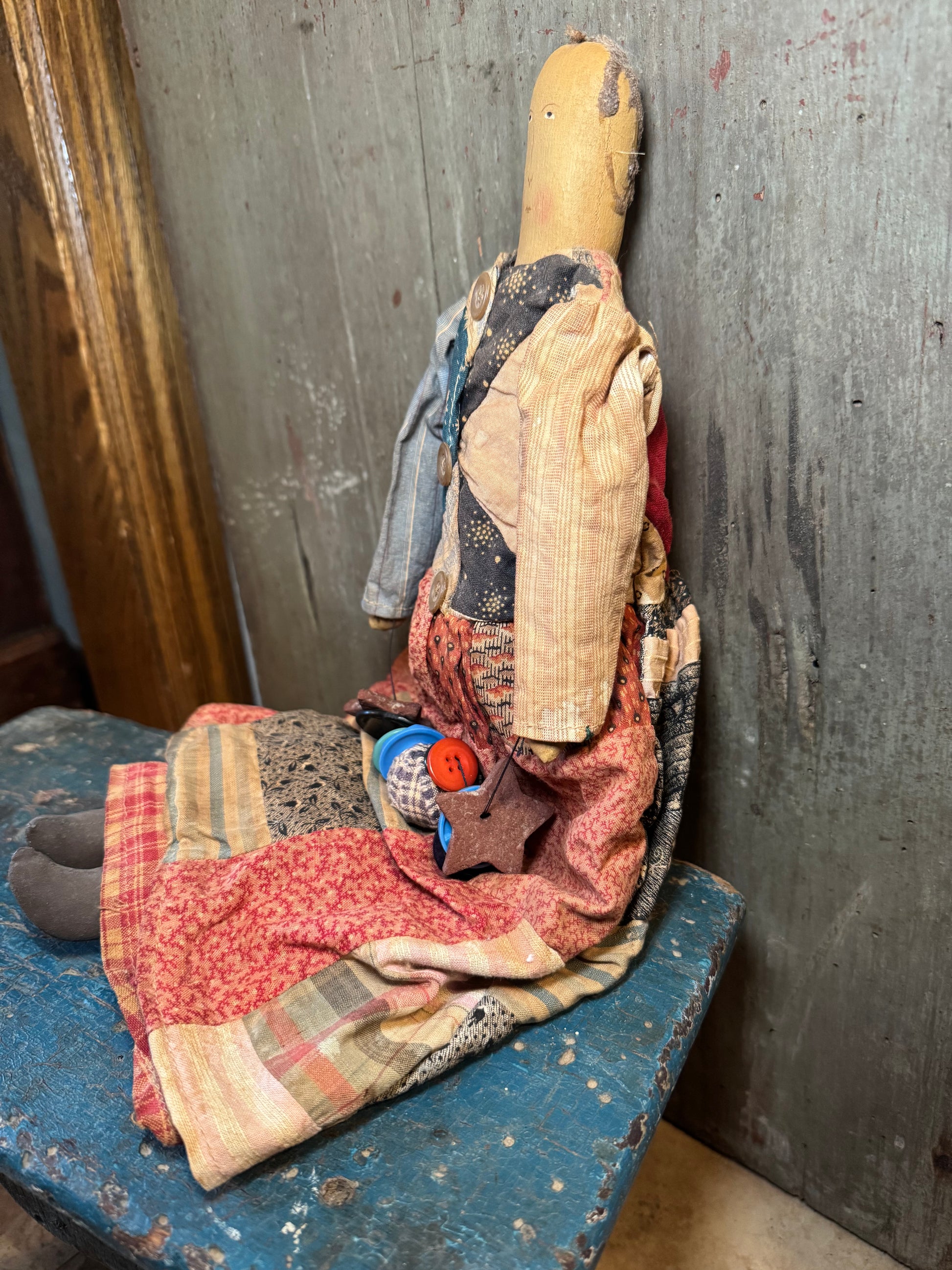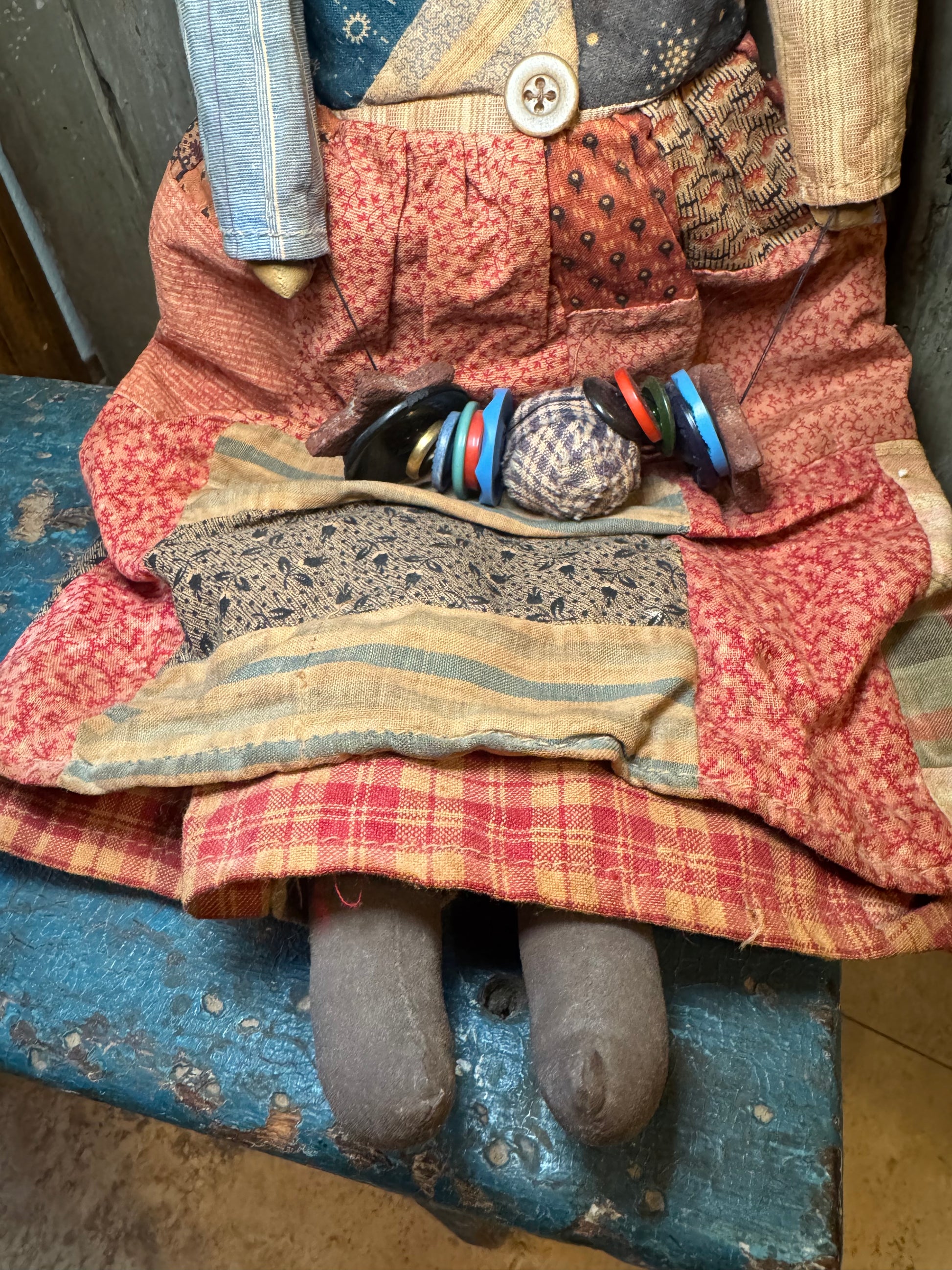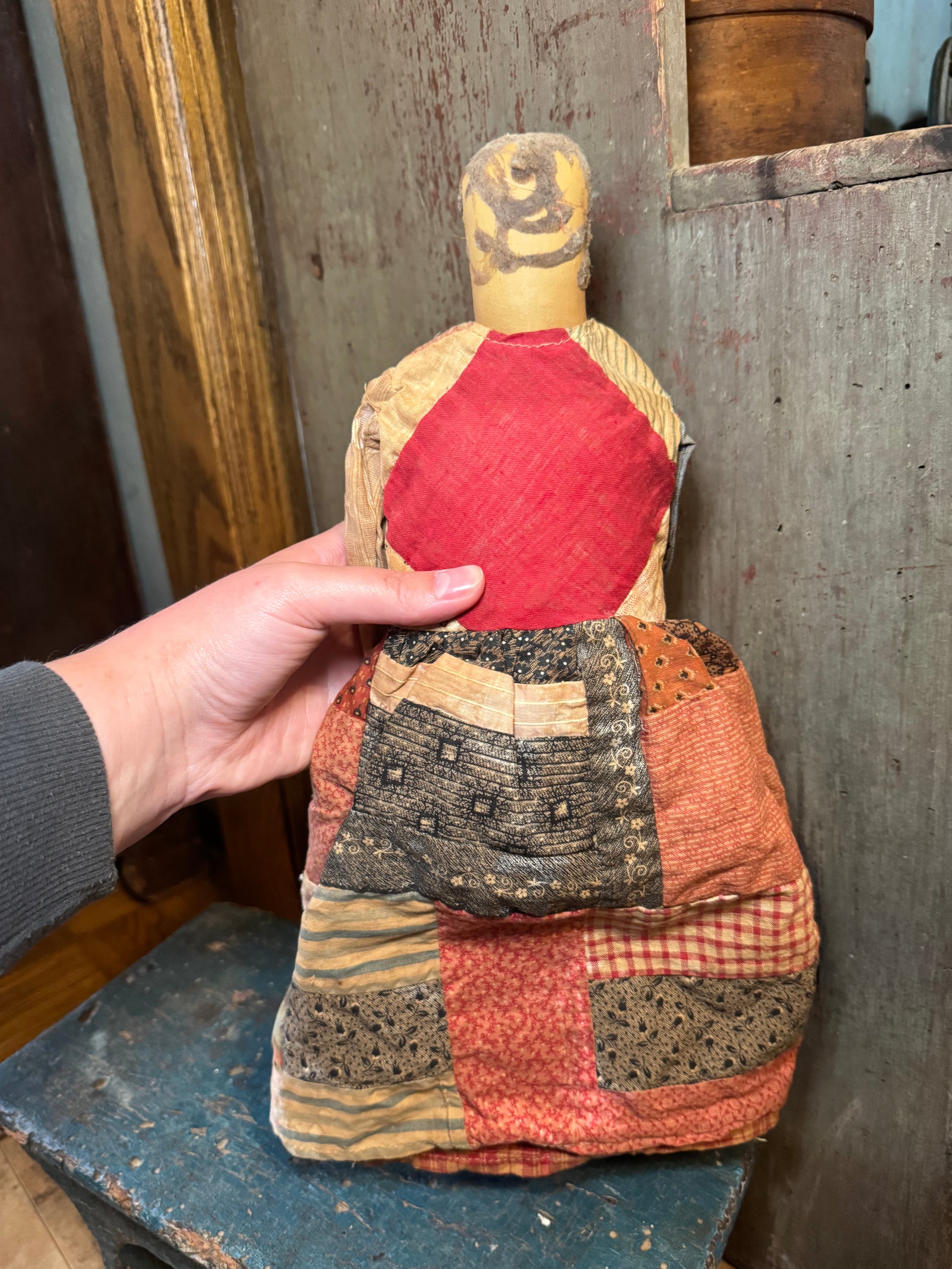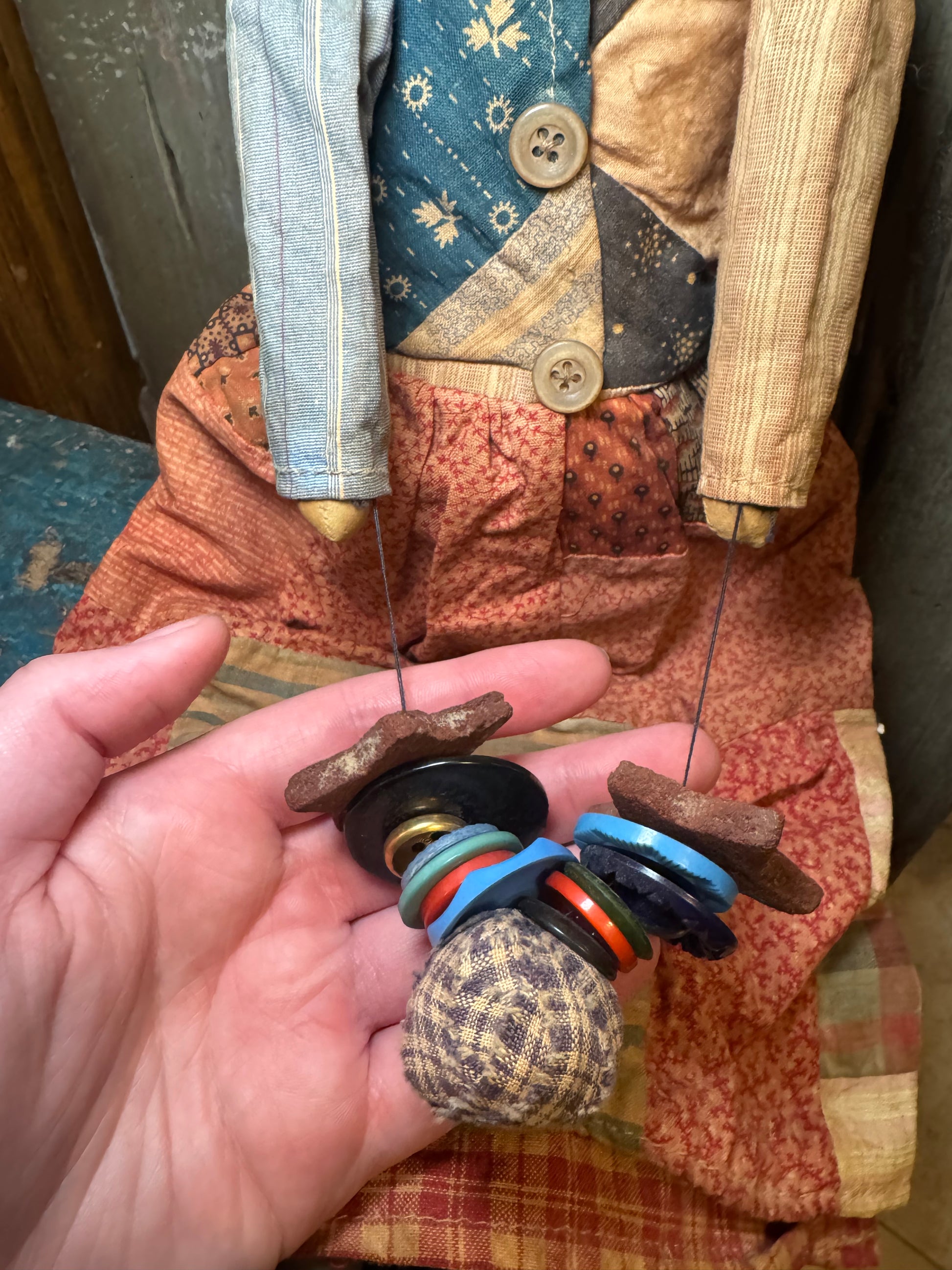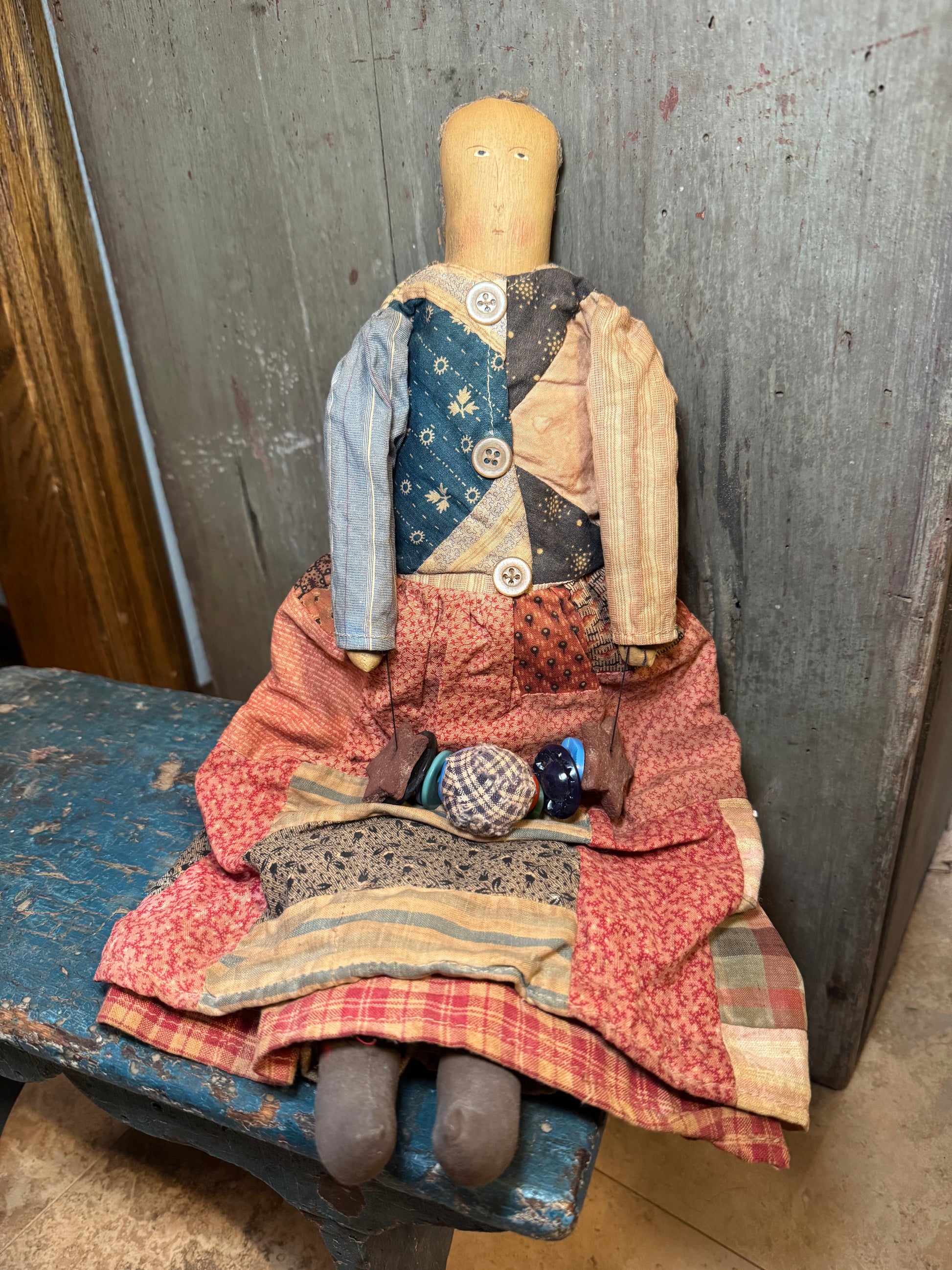 A true celebration of early American folk art—this one-of-a-kind primitive doll features a handpainted face, button accents, and a dress crafted from a well-loved antique patchwork quilt. She holds a whimsical garland of stars, antique buttons, and a tiny rag ball, adding texture and story to any primitive or colonial display. Measures approximately 18” x 7” x 3”. Price includes shipping.