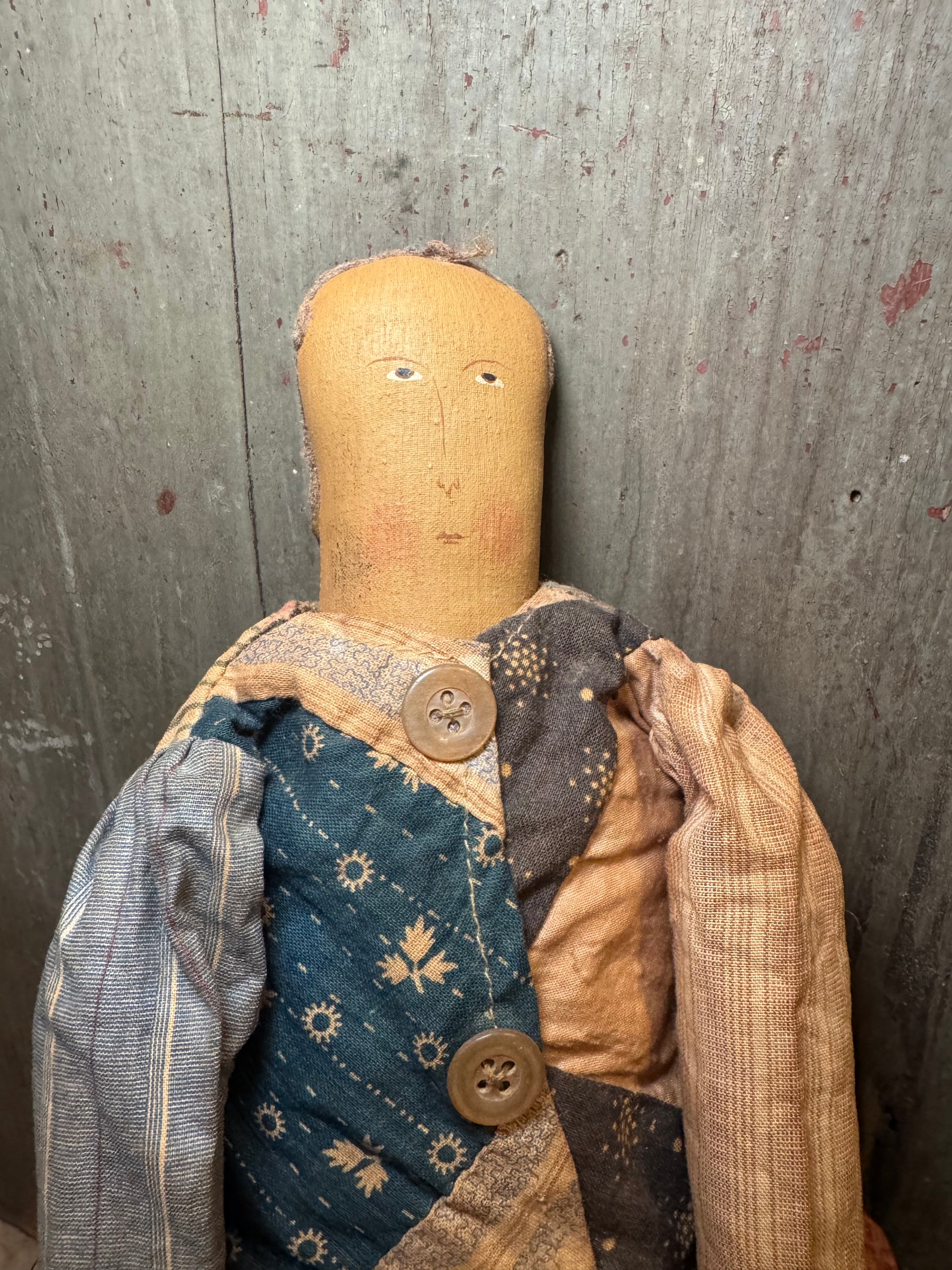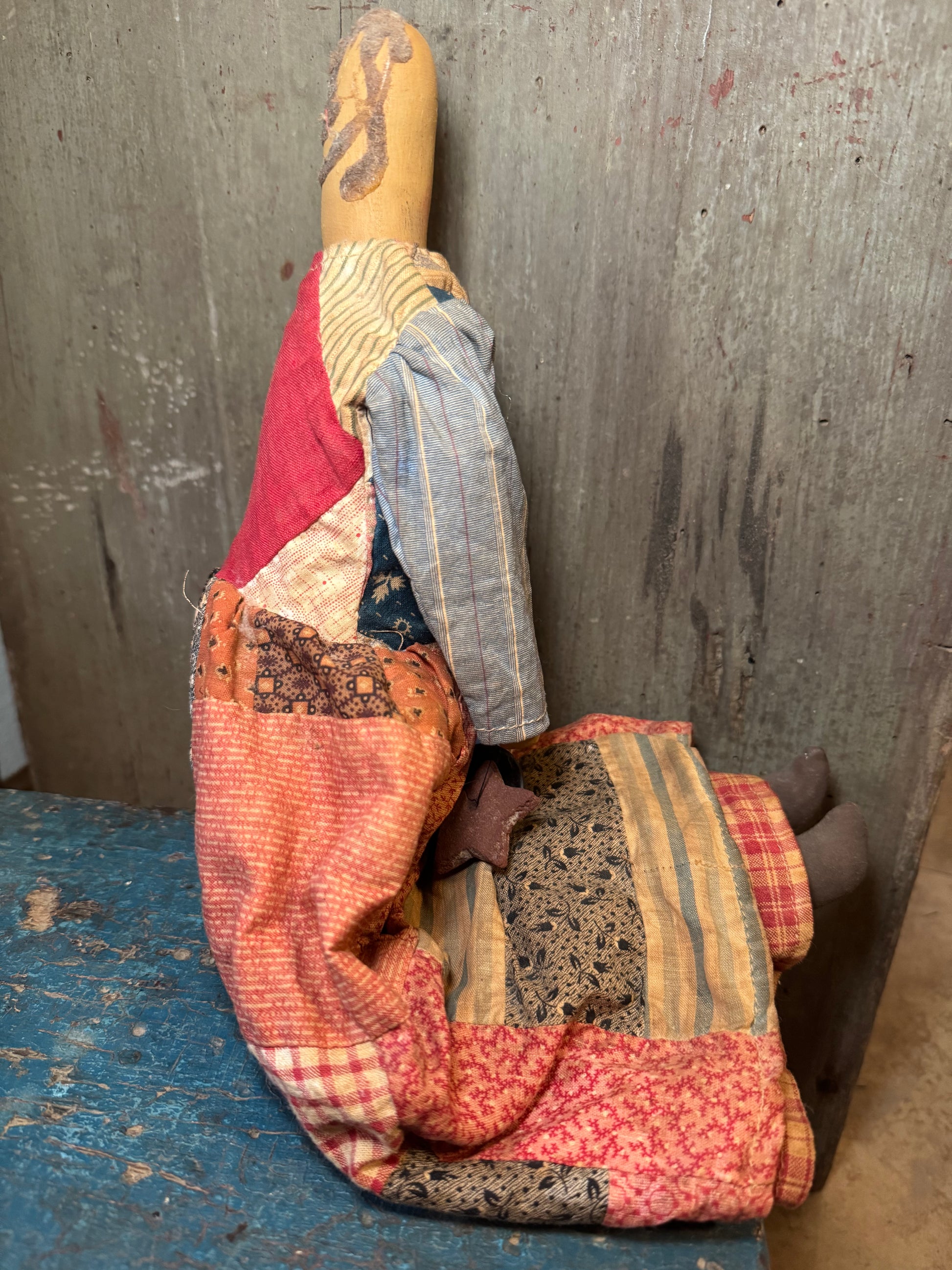 One-of-a-Kind Primitive Antique Patchwork Quilt Doll with Star, Rag Ball, & Button Garland