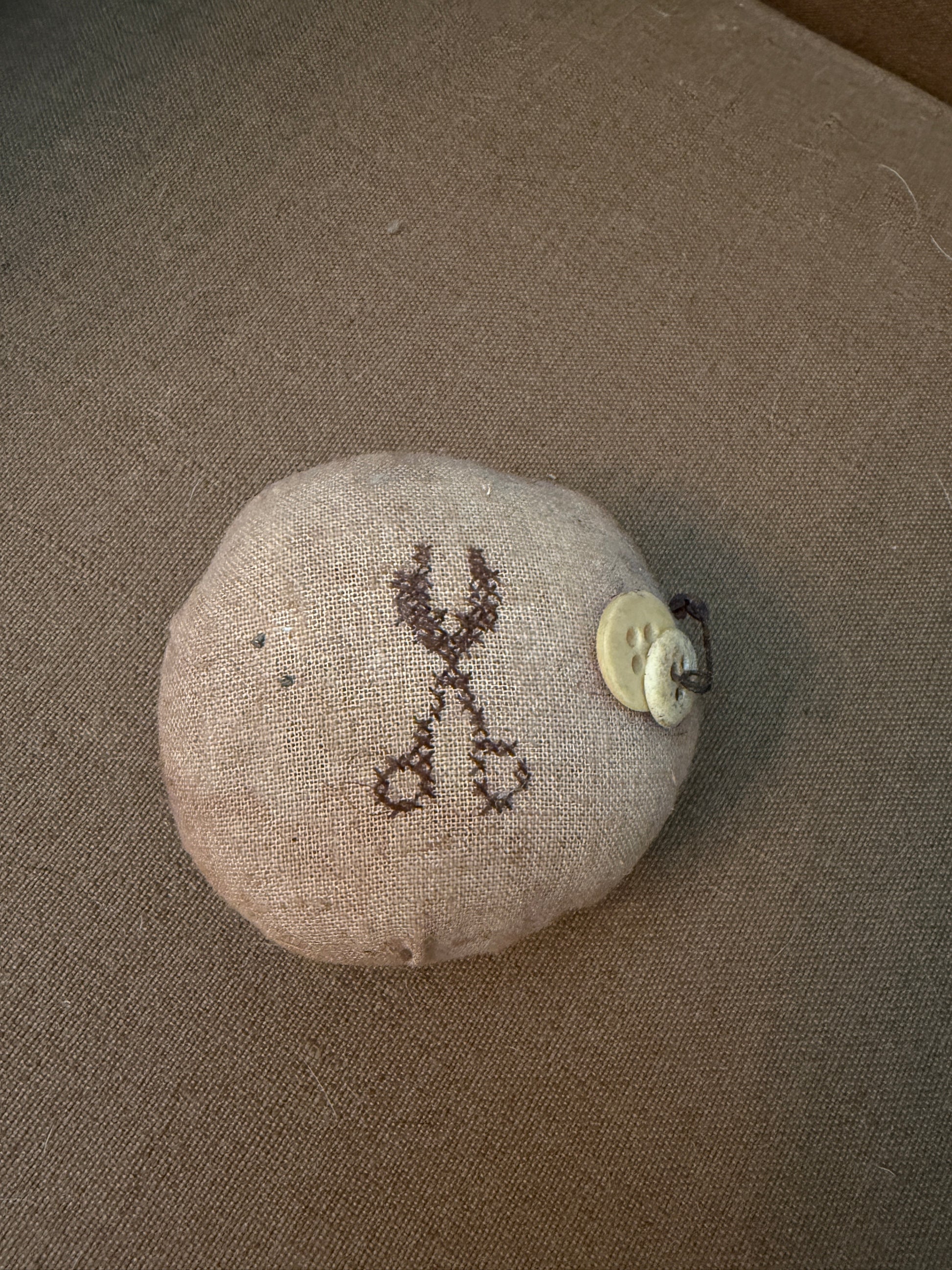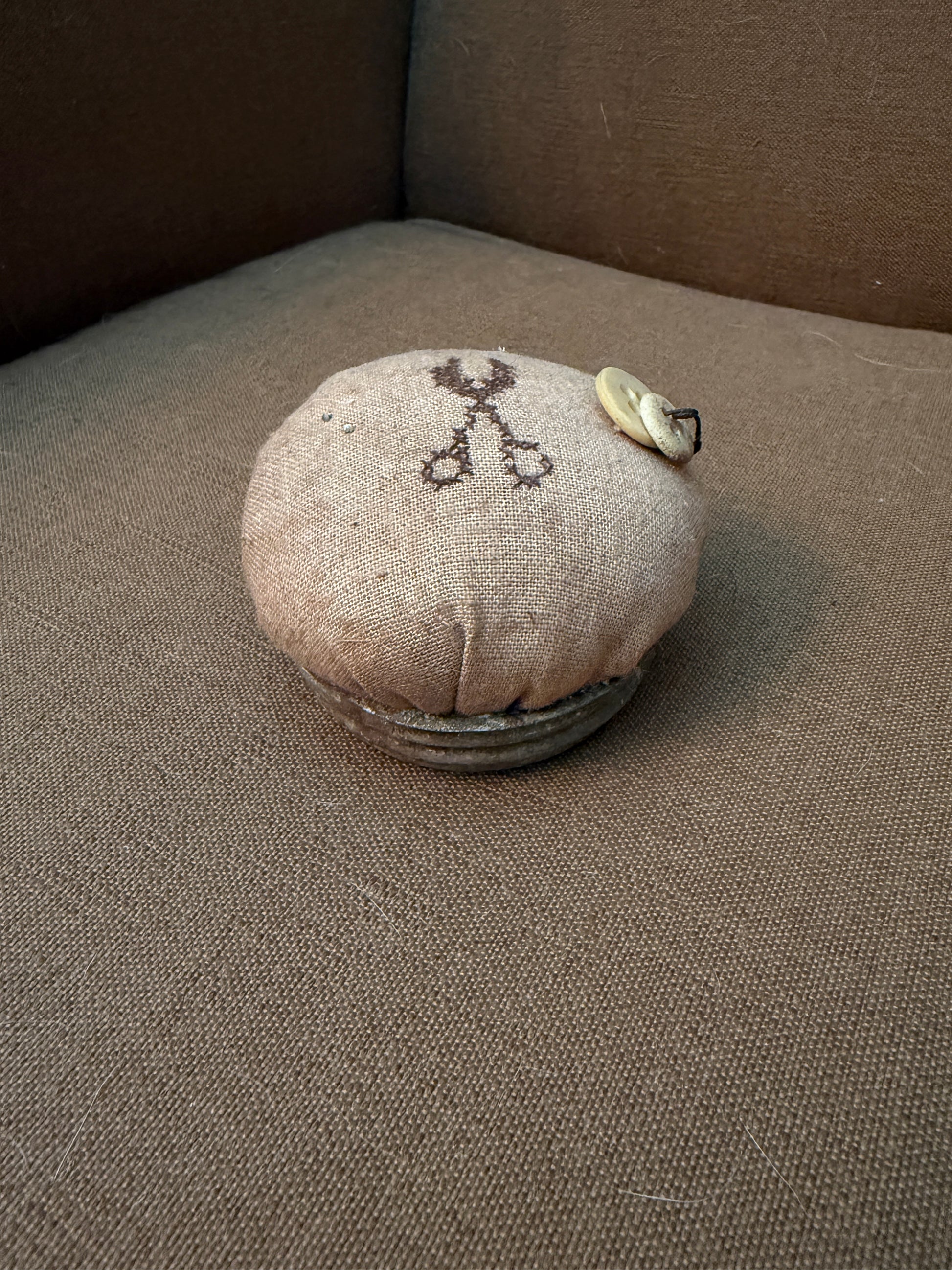 This primitive pincushion features a hand-stitched scissors on aged linen. It is both functional and decorative! Price includes shipping.