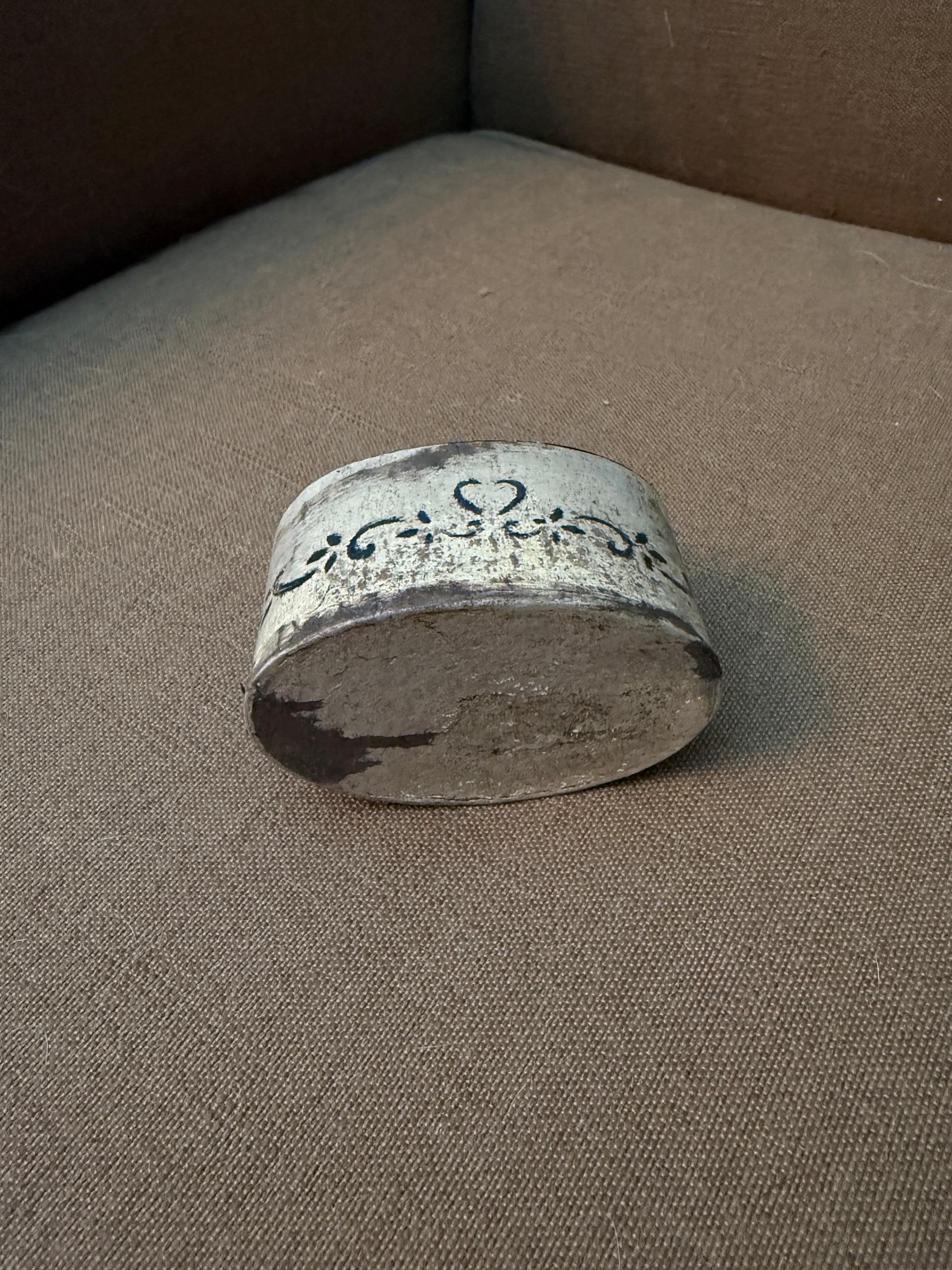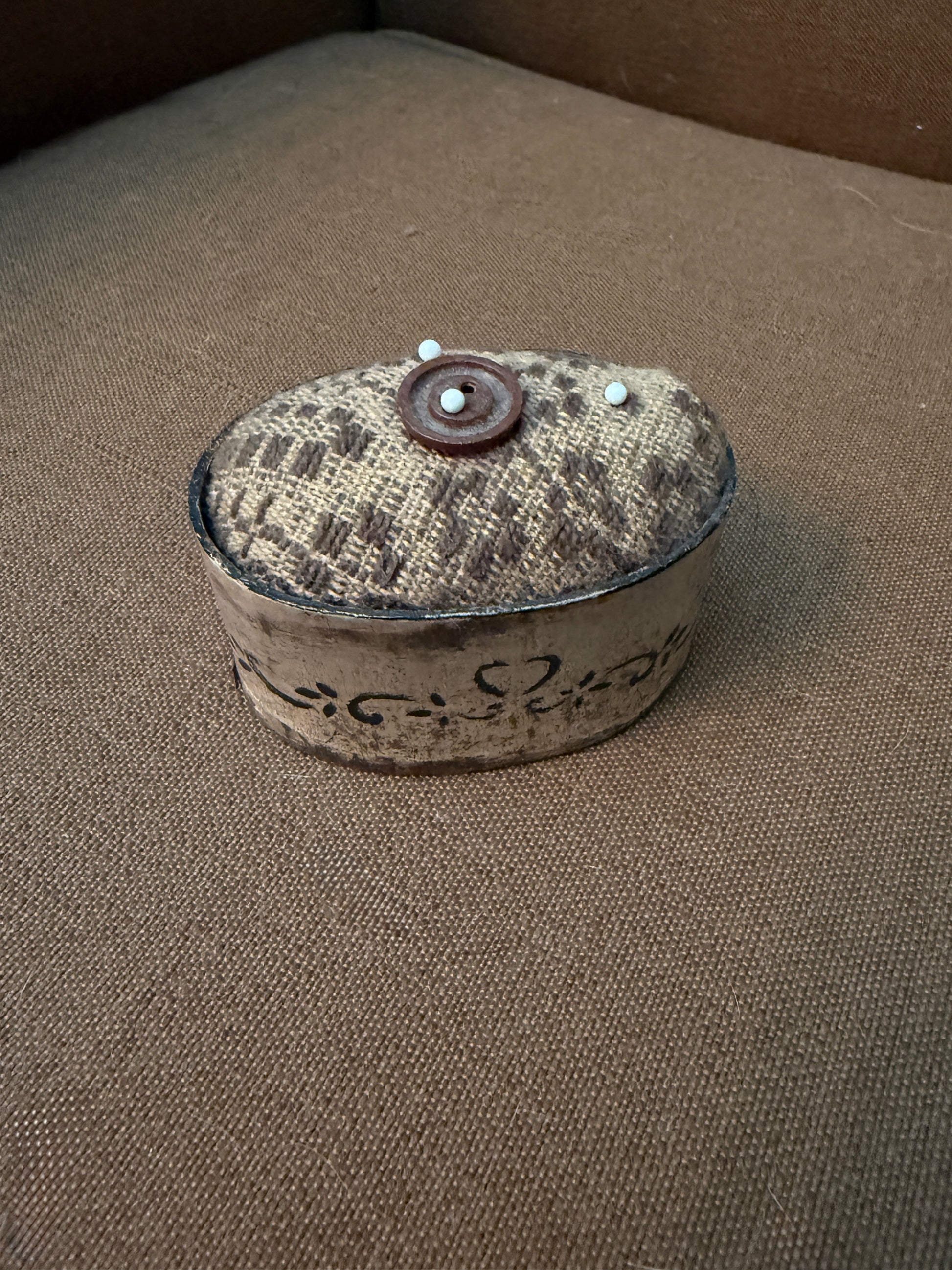 Reproduction pantry box pin cushion. It is 2 x 3". This pin cushion is both functional and decorative! Price includes shipping.
