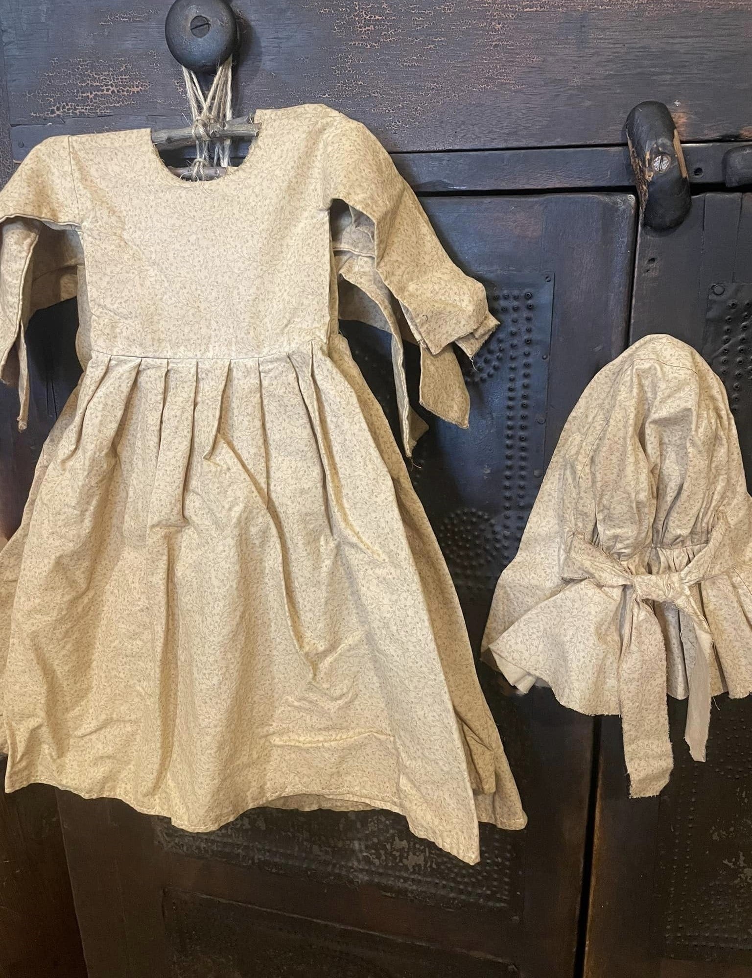 These prairie dresses look wonderful displayed with a bonnet, stockings or children’s shoes. They are coffee stained to give them a primitive look. Each dress comes with a wooden twig and twine hanger. Colors will vary because of distressing. Made with love by Patricia Breslin. Size: Dress is approx. 20" long and the bonnet is approx. 10 1/2" long.