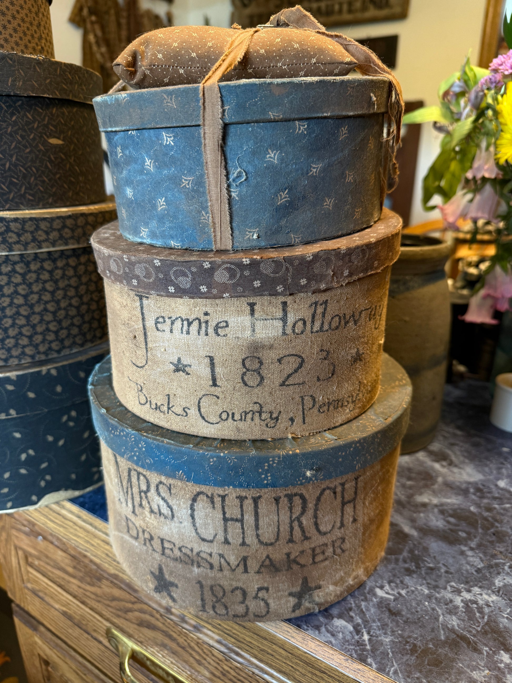 Set of 3 primitive fabric covered boxes with pin keep. The stack is 13 1/2" high x 9" wide. Price includes shipping.