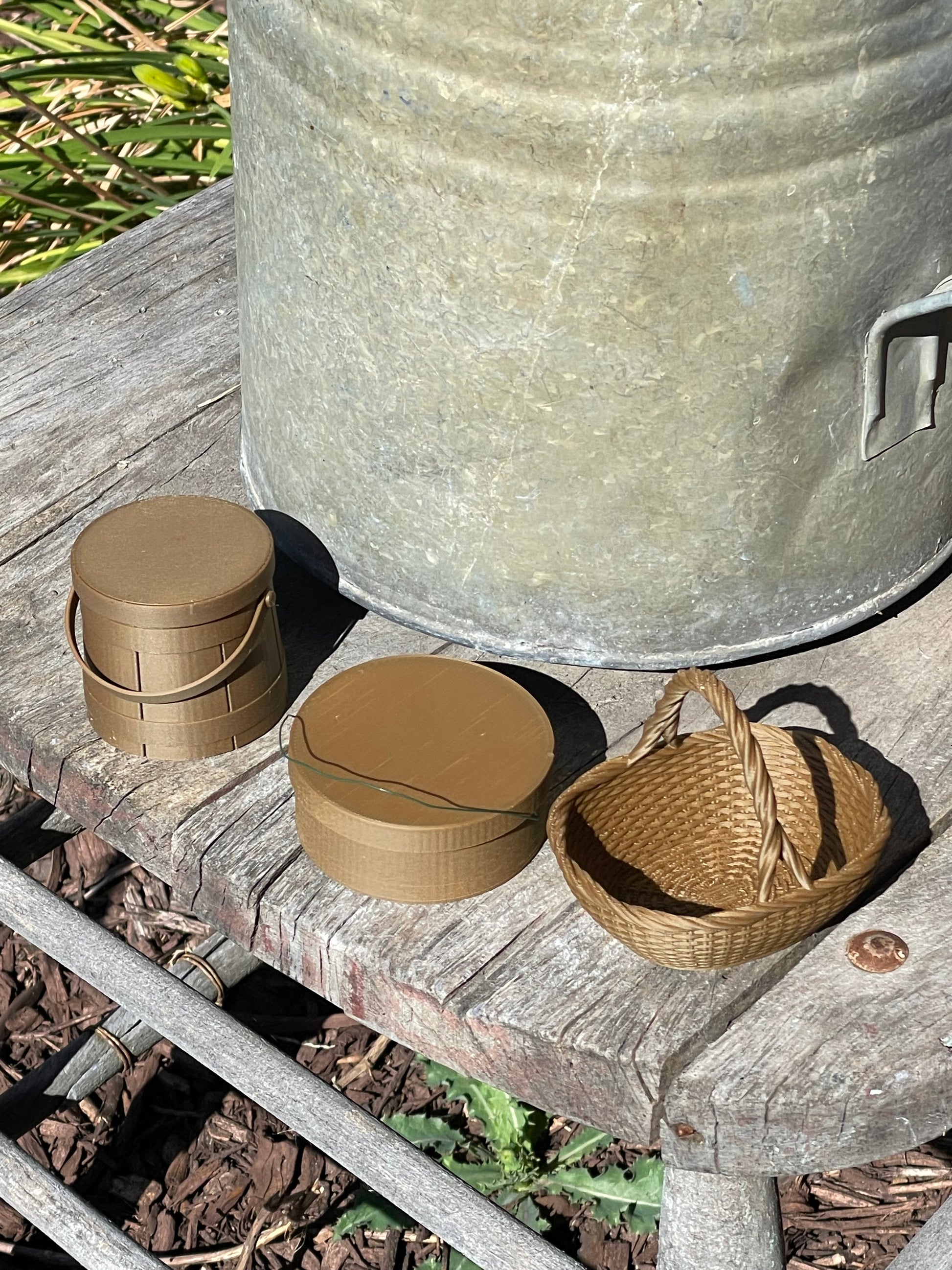 This set of ornaments include three baskets, three pantry boxes and three firkins! They look wonderful on a primitive Christmas tree or with Halloween/Fall decor!