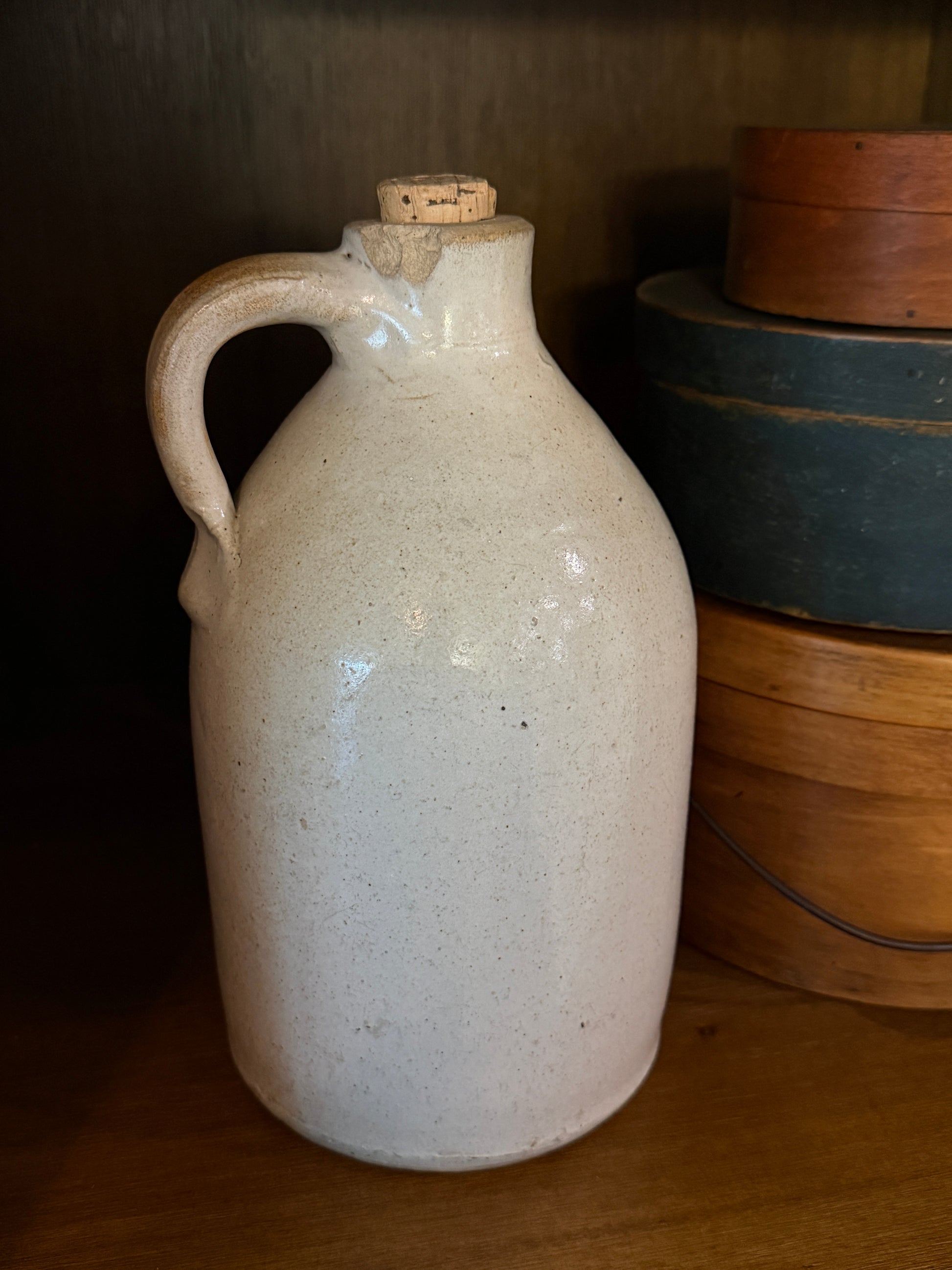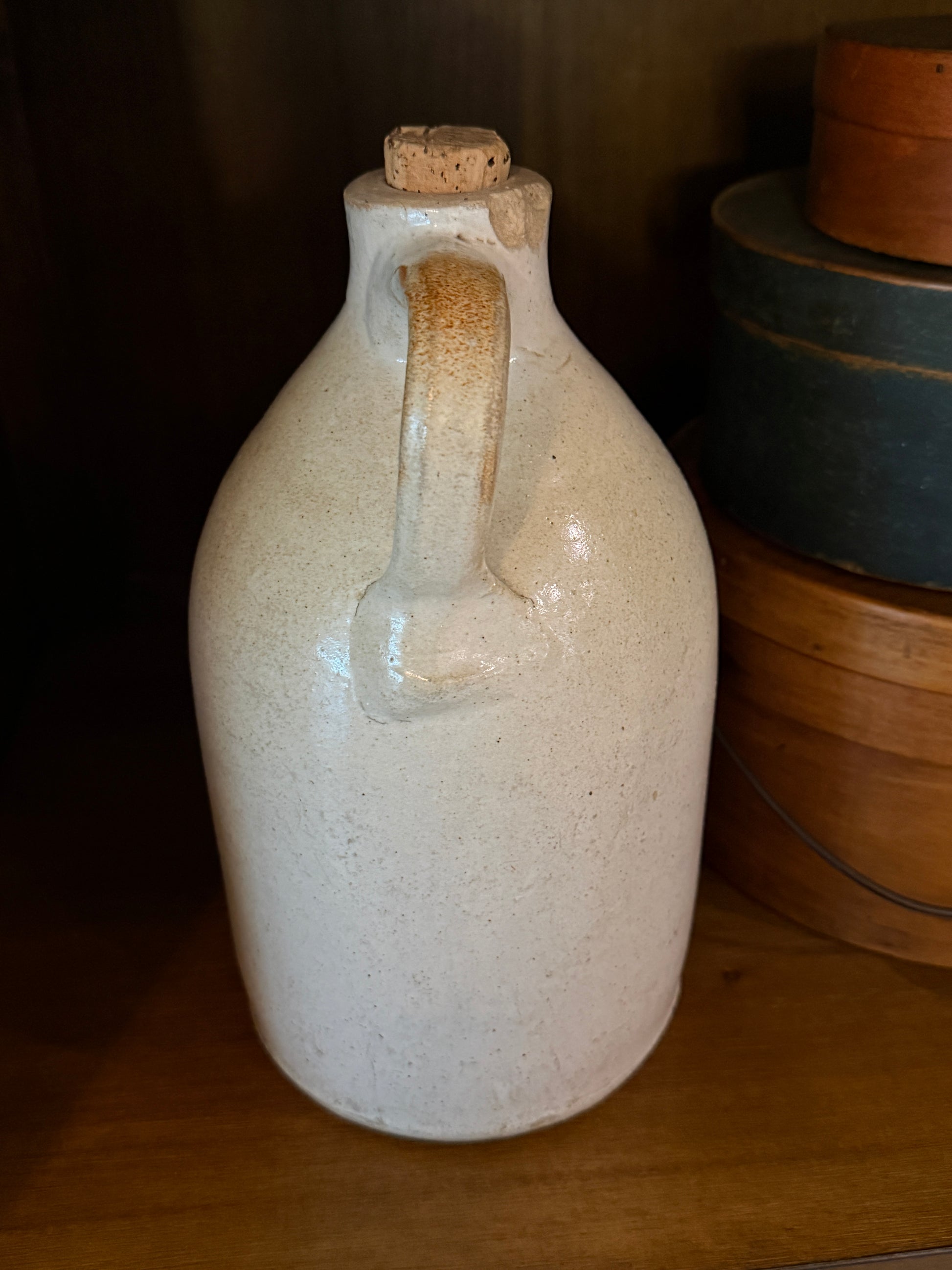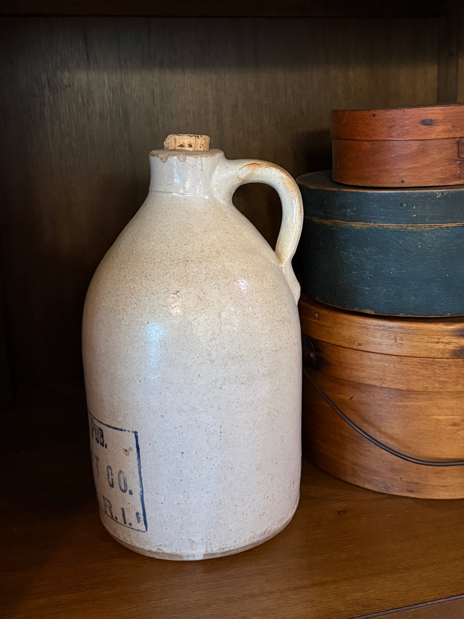 Exceptional late 19th century stoneware jug with bold cobalt advertising stencil for Prov. Pub. Market Co., Providence, R.I. Used in a general market setting for vinegar, syrup, cider. Retains original cork; Minor chip to rim consistent with age. A standout example of early American advertising stoneware. Would be perfect in a tavern!