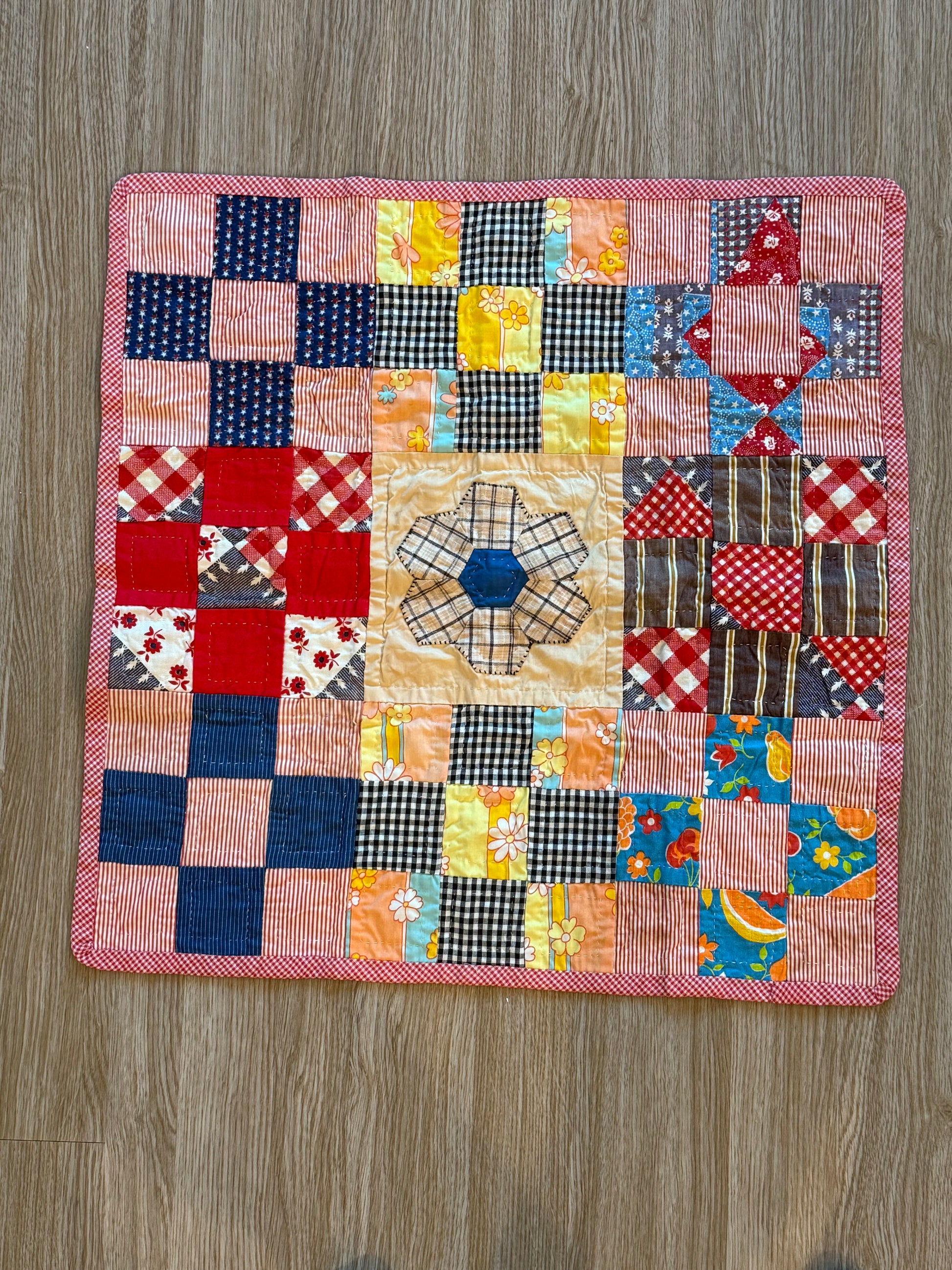 A small handmade vintage quilt square in vibrant colors. In good condition!