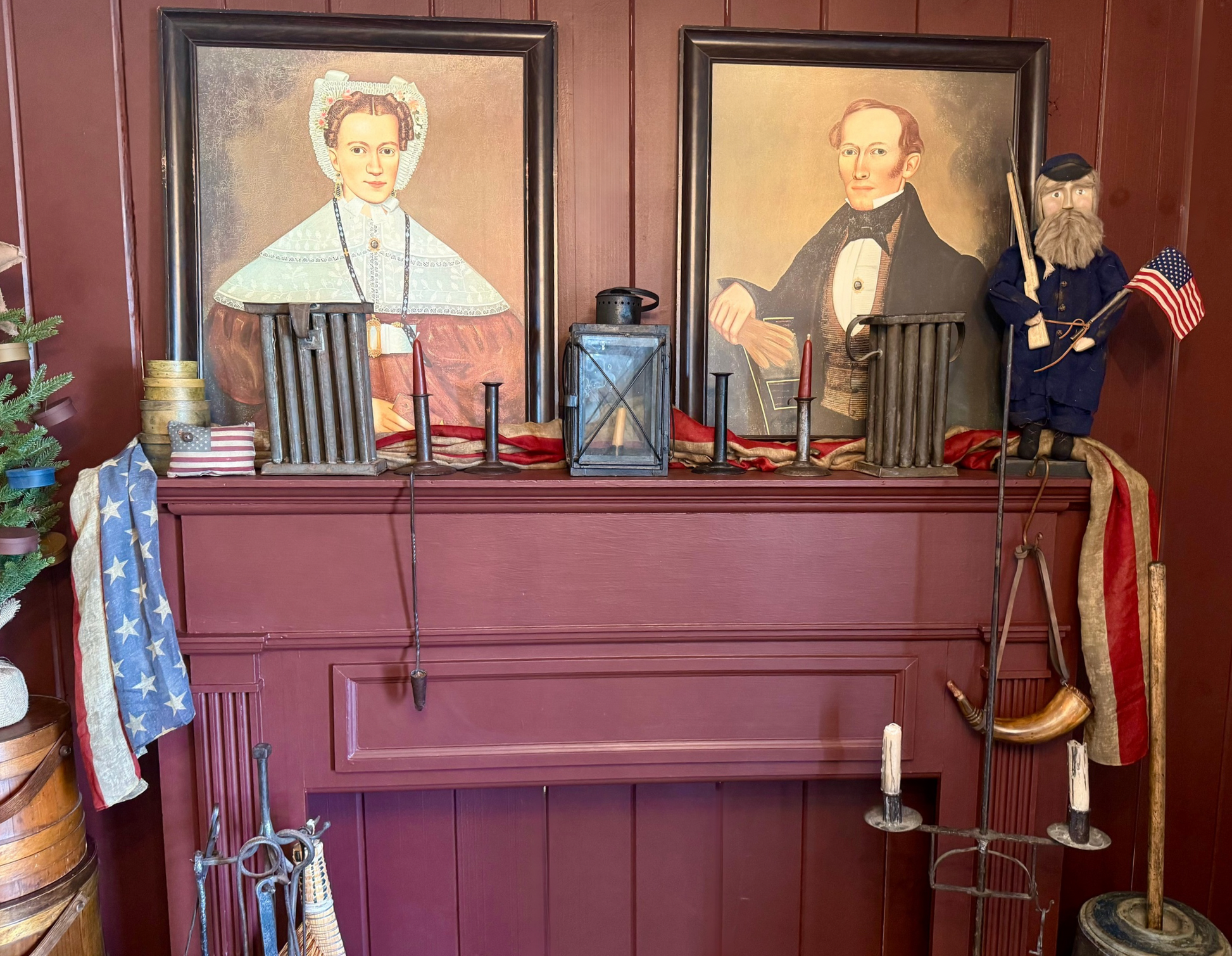 This tea-stained American flag mantel scarf is ideal for styling across a fireplace mantel, pie safe, dry sink, over a stairway railing, cupboard door, or folded on a blanket chest. It measures approximately 37” x 70”. The price includes shipping.